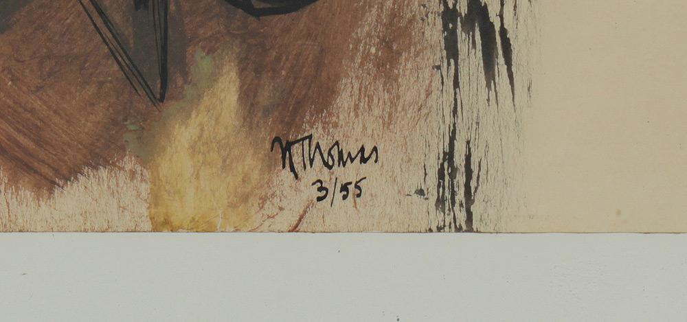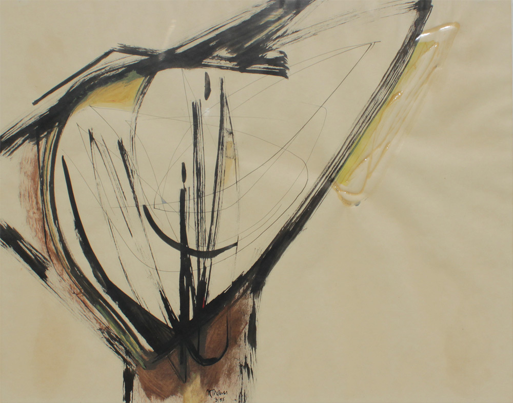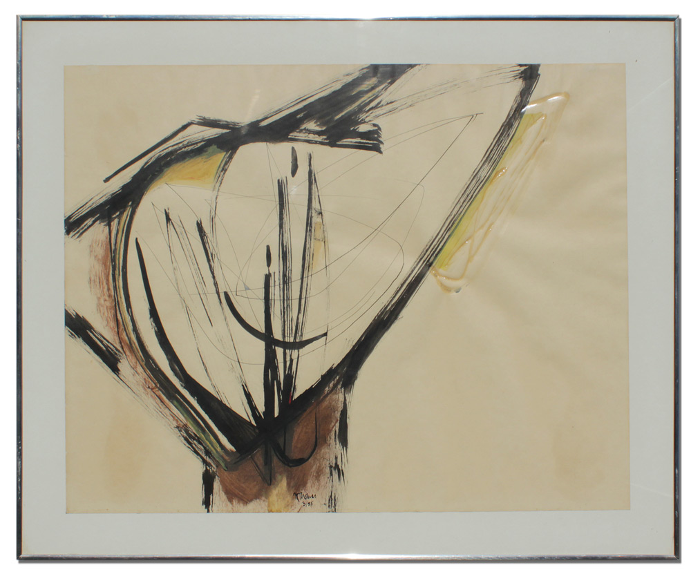 ABSTRACT ART SIGNED N. THOMAS: Mixed Media watercolor and glue?, 19'' x 24'', framed, 23'' x 28 1/2'', dated 1955.