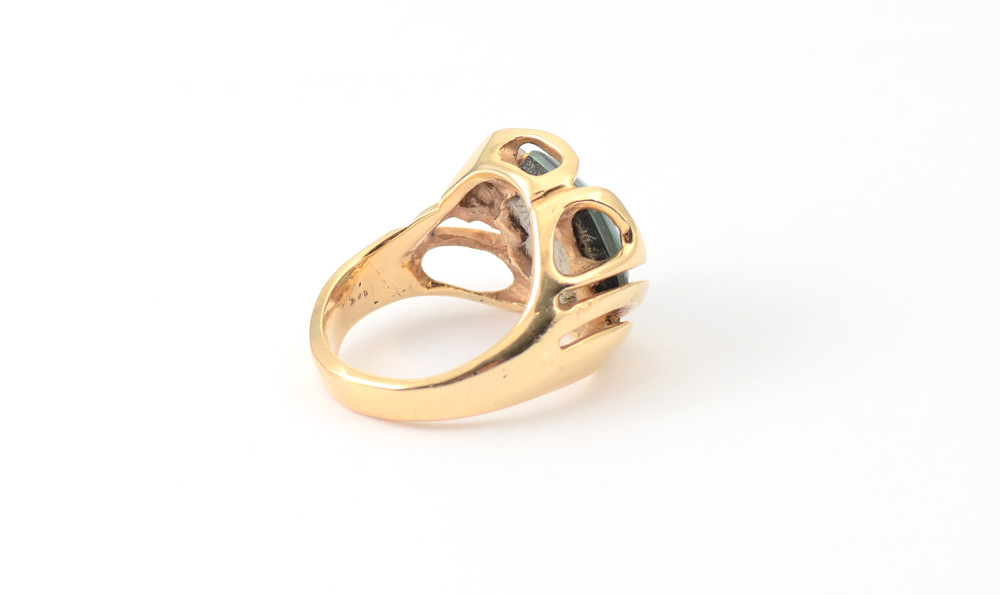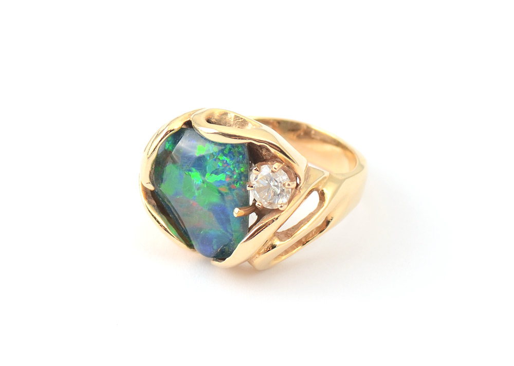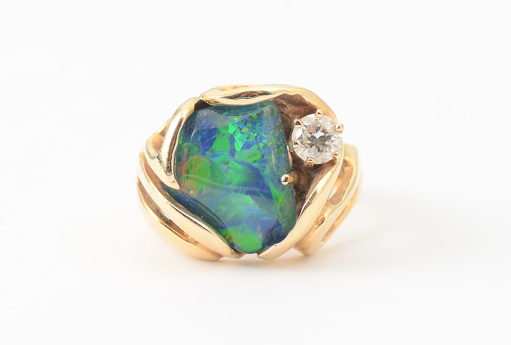 GENTS OR LADIES OPAL TRIPLET AND DIAMOND RING: 14K yellow gold ring contains one large opal triplet off set with a one round brilliant cut diamond, approx. .50 Ct. Rated SI2 in clarity and H in color. Weight: 12.8 grams. Size: 9
