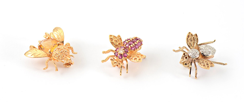3 GOLD BUMBLE BEE FIGURAL PINS: Three 14K yellow gold bee pins contain citrine, rubies (1.00 Ct) and diamonds (.25 Ct.) Wear as a pin or display as a miniature. Length approx. 1''. Weight: 10.4 grams.