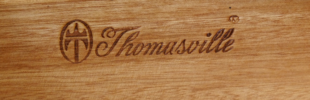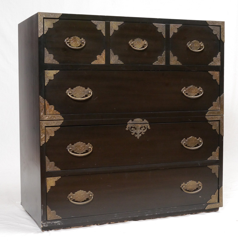 THOMASVILLE CHINESE STYLE 4 DRAWER CHEST: 4 drawers with applied metal decoration to create an oriental flair. Thomasville marked inside drawer. Overall measures 37'' h. x 36'' x 18''.