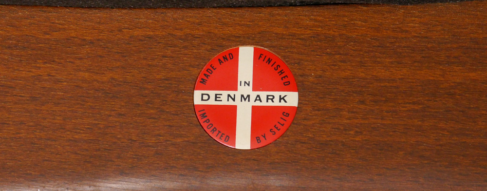 SELIG DANISH MID CENTURY MODERN ARM CHAIR: Mid Century Selig walnut arm chair, marked on lower back seat support. Patterned green upholstery. Overall measures 27 1/4'' h. x 24'' x 20''.