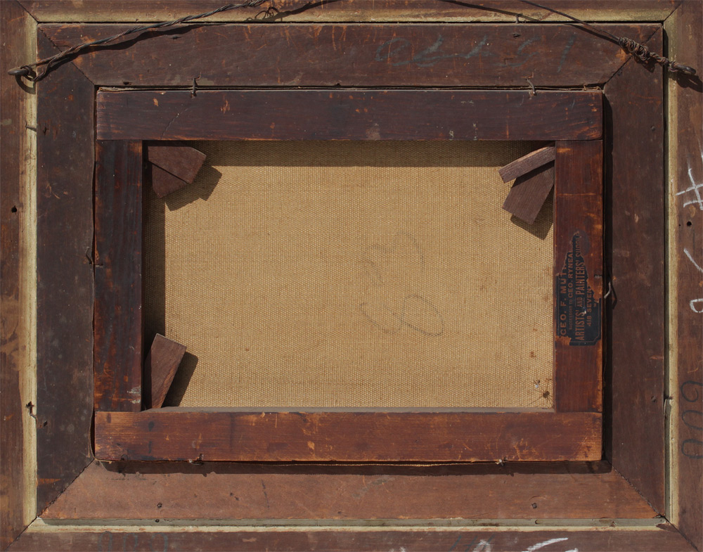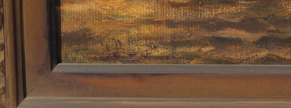 CONDITION: Needs cleaning, small puncture in canvas in upper right corner, frame has been overpainted and does have several spots of missing gesso.