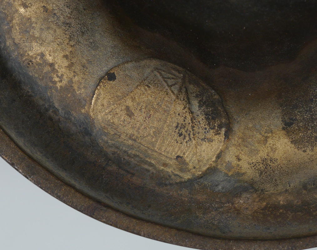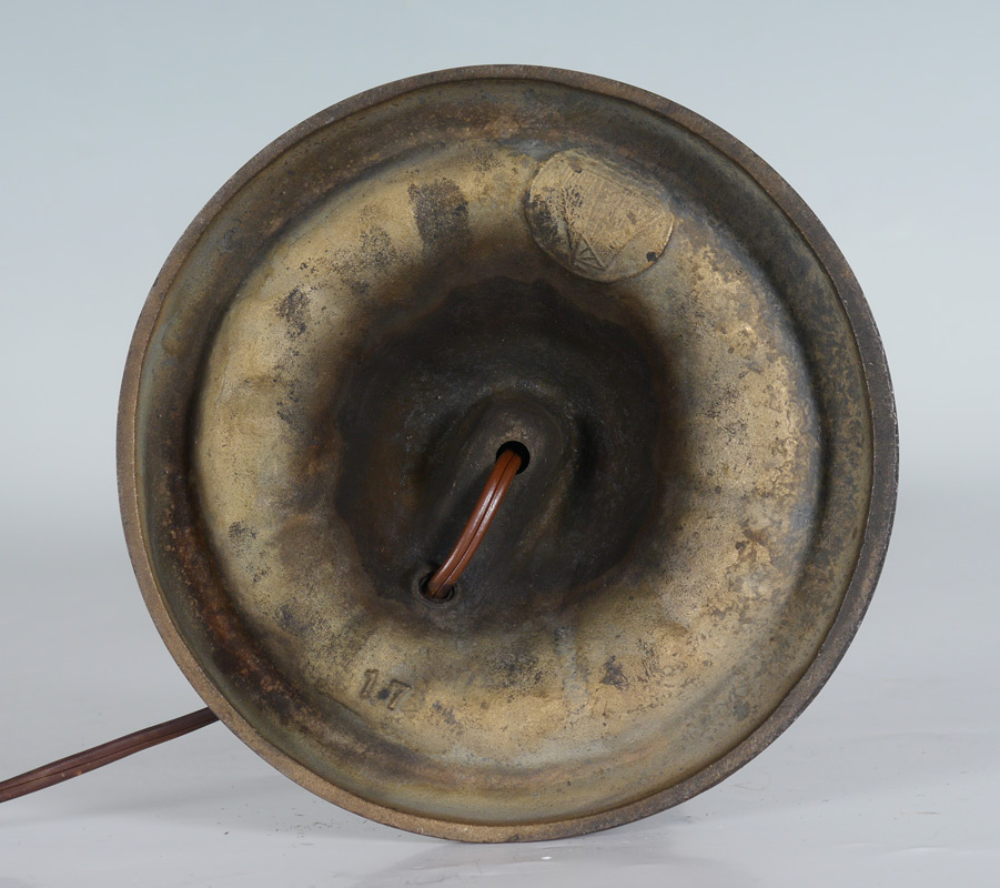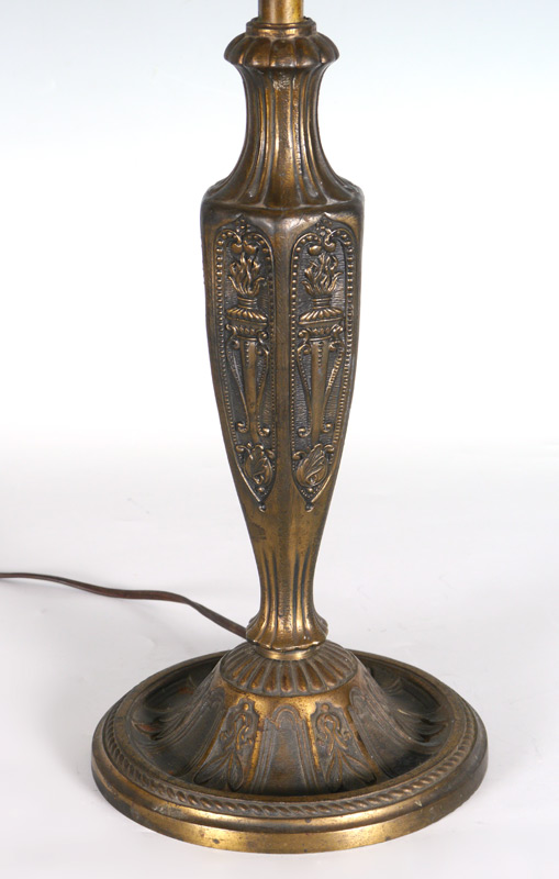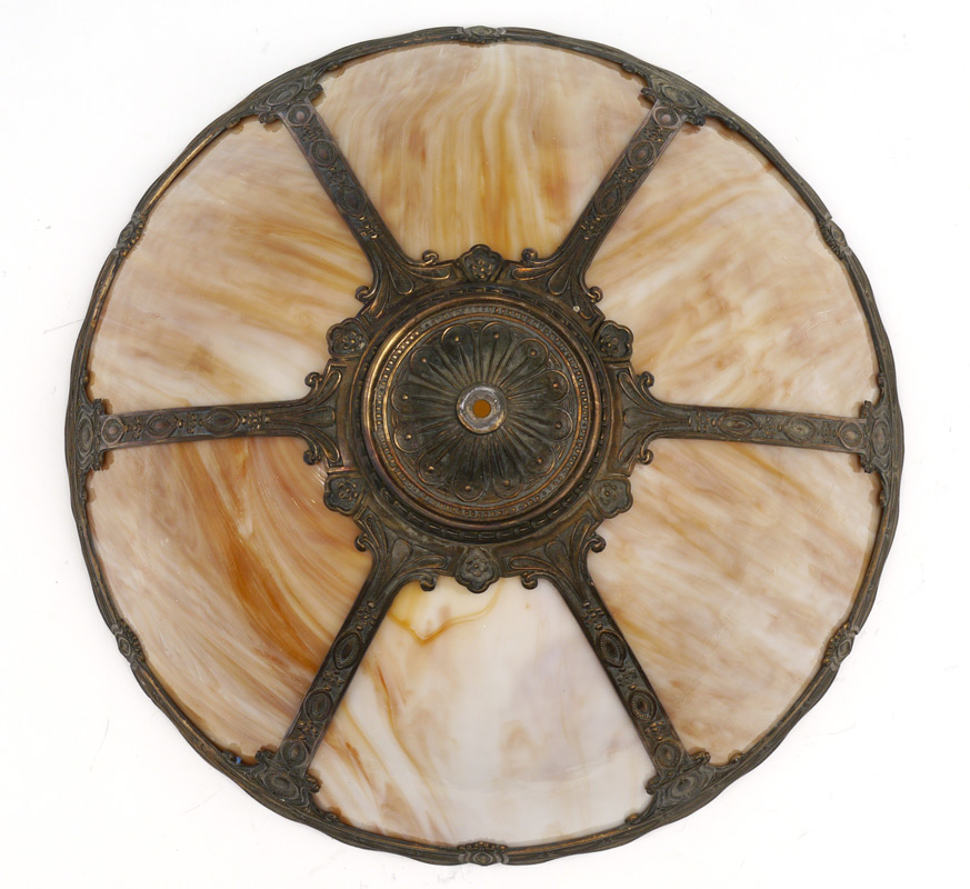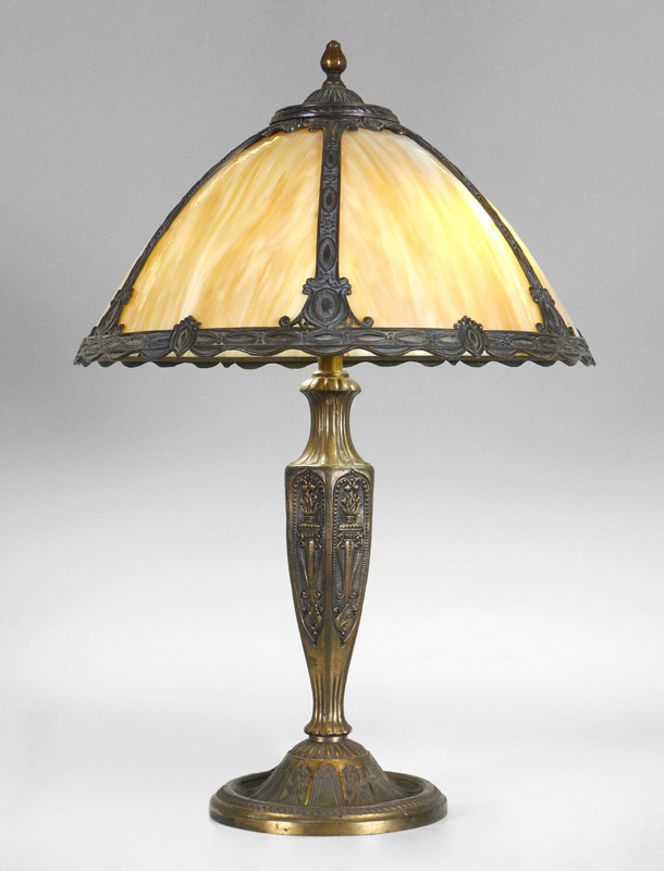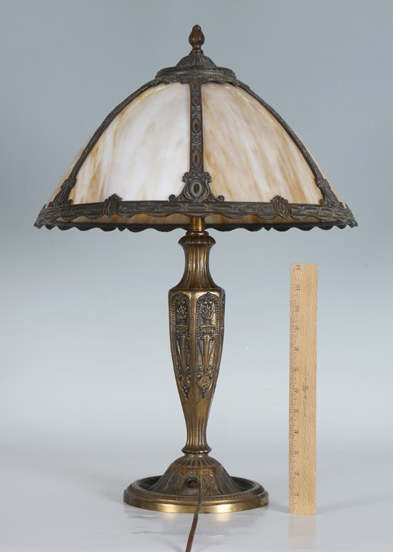 SAIL BROTHERS BENT PANEL SLAG GLASS LAMP: Patinated metal with floral and flaming torched motif, double socket fixture. 23 1/2'' h. x 7 1/2''. 6 caramel slag glass bent panel shade with filigree, 8 3/4'' h. x 16 1/4''.