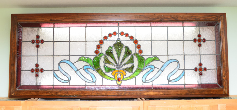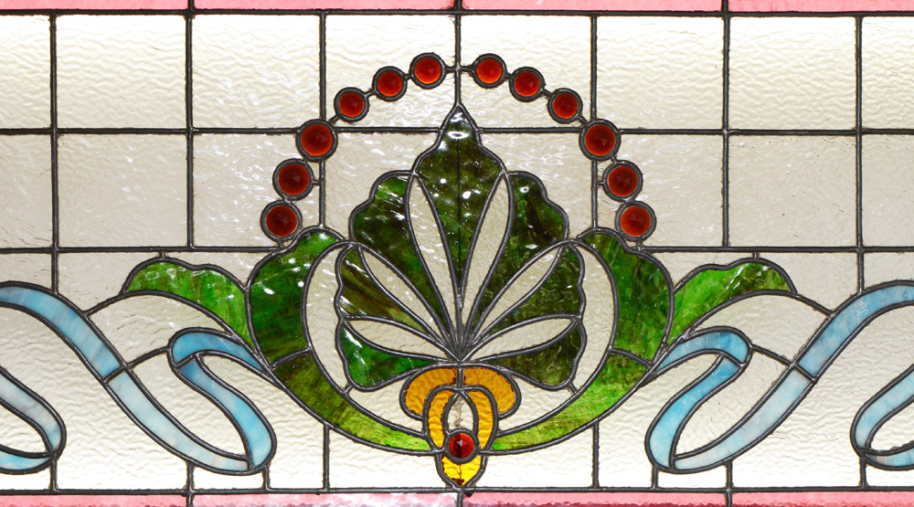 VINTAGE STAINED GLASS WINDOW: Garland motif decoration with red jewels, pink glass border. Panel measures 19 1/2'' x 59 1/2'', sold in a illuminated shadow box frame, 24 1/2'' h. x 63 3*4'' x 4 1/2''.