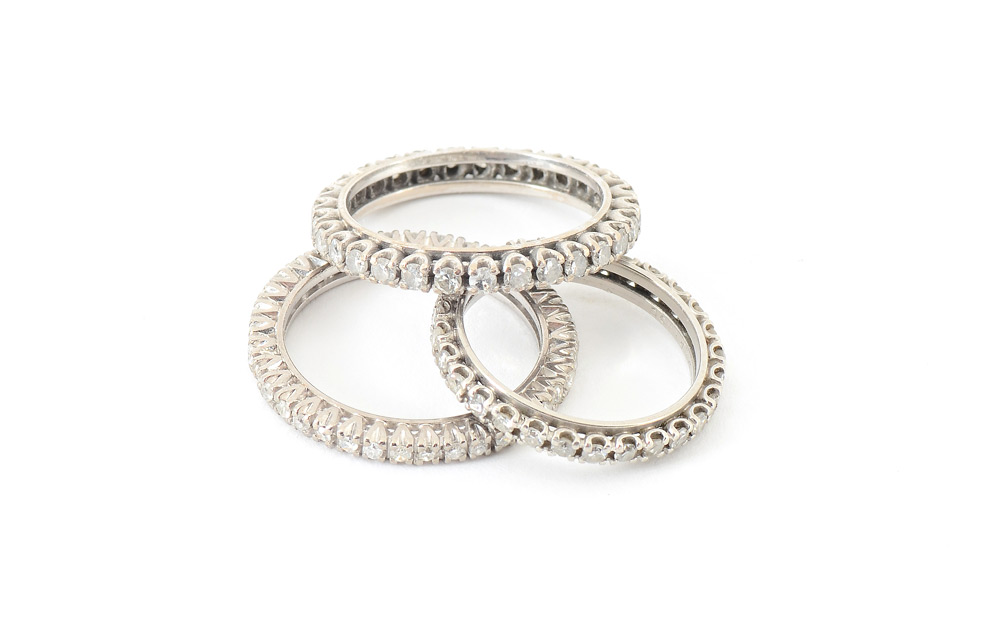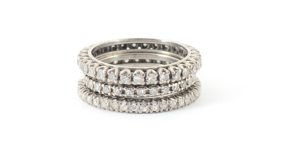 SET OF 3 DIAMOND ETERNITY BAND RINGS: Three stacking bands of diamonds. One is platinum, two are 14K gold. Diamonds total approx. 1.25 Ct., averaging VS-SI in clarity, G-H color. Sizes 5 and 7. Platinum weight 2.5 grams. Gold weight 5 grams.