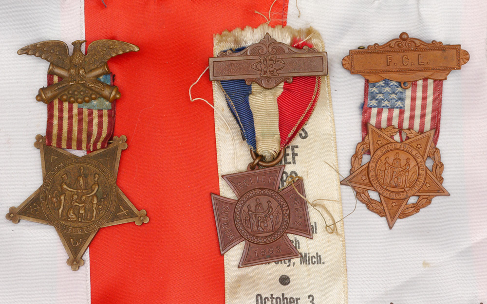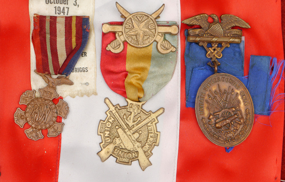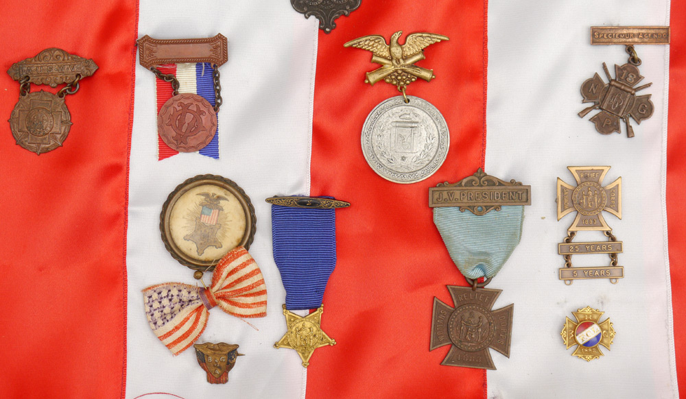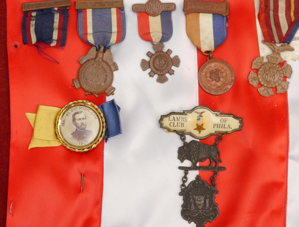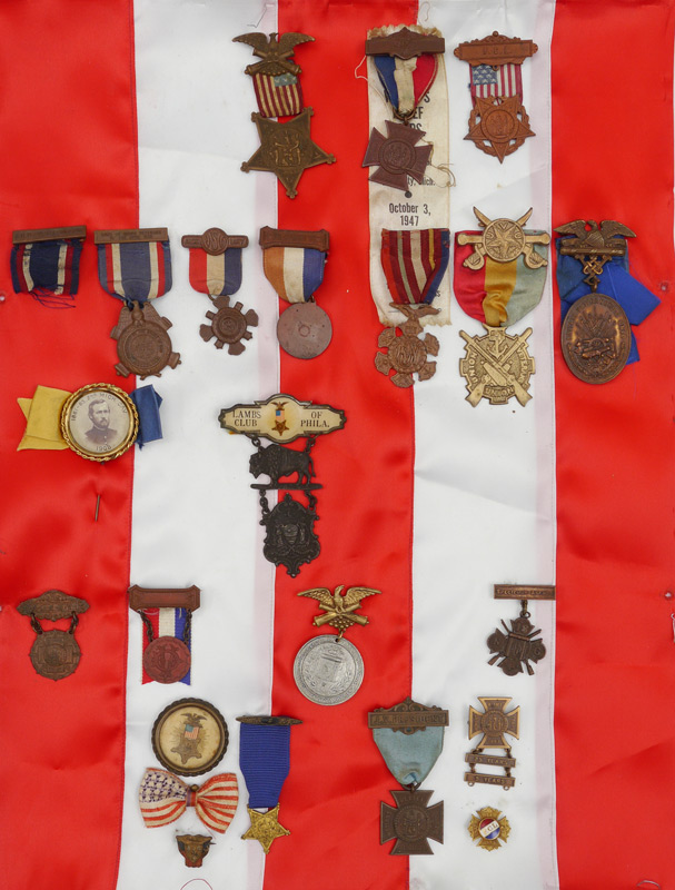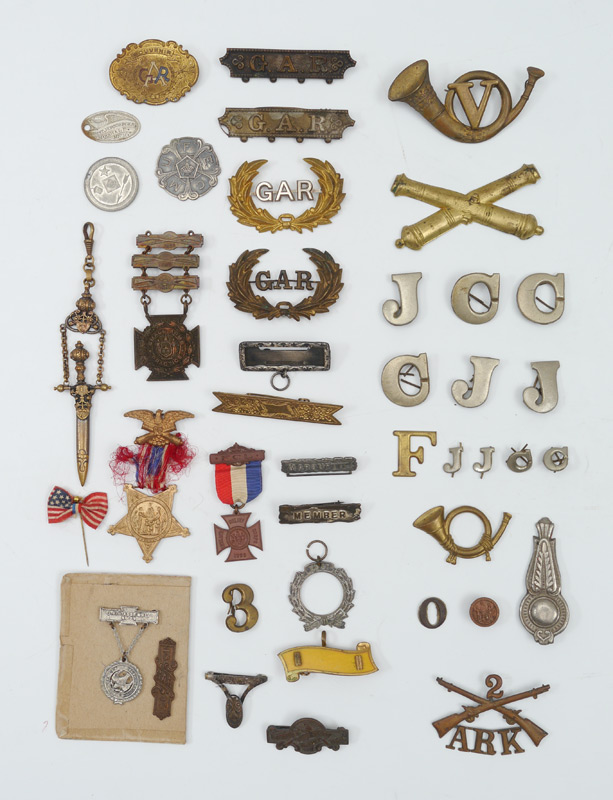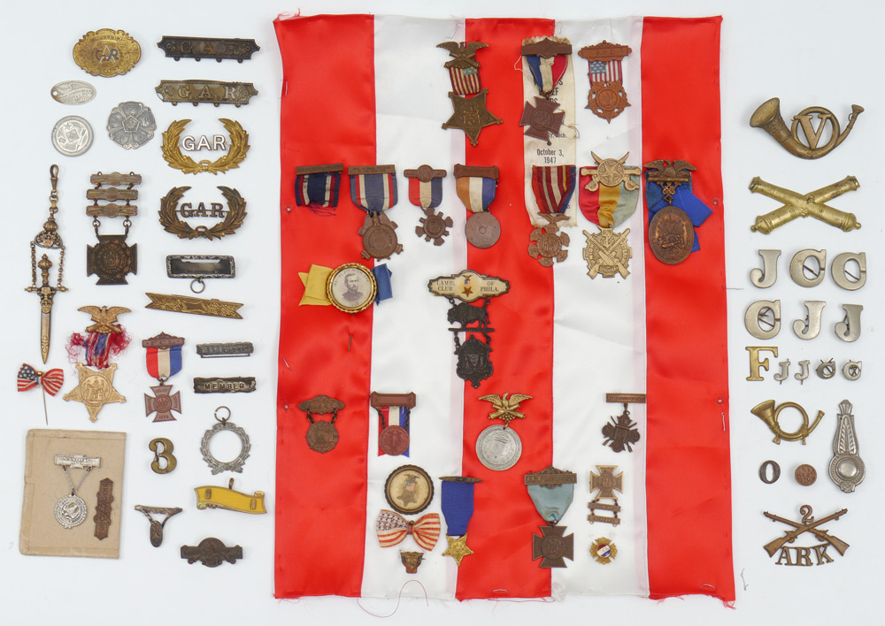 COLLECTION OF CIVIL WAR VETERANS MEDALS: An assembled collection of approx. 30 veterans and related fraternal organization medals to include G.A.R., Lambs Club, Women's Relief Corp, Union Veterans Union and others. Also sold with an assortment of unit letters, hat badges and more.