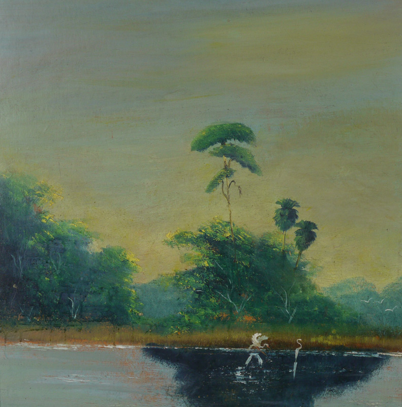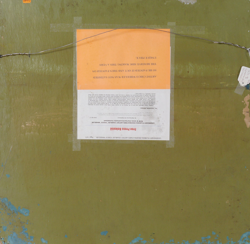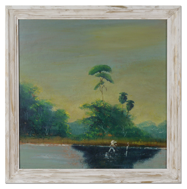 WHEELER, Charles ''Chico'', (American, 20th Century): Florida Highwaymen backwater scene with typical Wheeler ''dancing'' heron, Oil/Upson, partial signature verso, 24'' x 24'', painted white frame, 23 3/4'' x 26 3/4''.