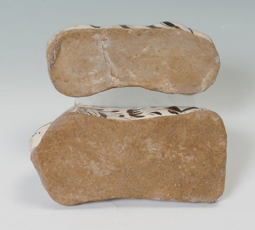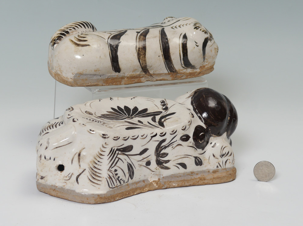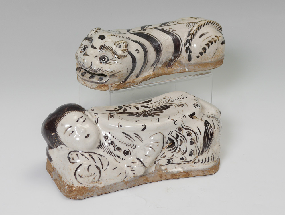 2 CHINESE STONEWARE FIGURAL HEAD RESTS: 2 pieces to include 1) Chinese Cizhou stoneware pillow in the form of a young girl, decorated with bold, brown brushwork over a white glaze. Cizhou wares are heavily potted and boldly decorated with freely drawn designs. This piece has a flattened concave surface decorated with a flower where the head would rest. 9 1/2'' long (24 cm) x 4 1/2'' wide (11.4 cm). 2) Chinese stoneware Cizhou pillow in the form of a reclining tiger, decorated with bold, brown brushwork under a heavy white glaze. Most likely dating from the late Qing or Republic Period. 8 1/2'' long (21.6 cm) x 3 1/2'' wide (9 cm).