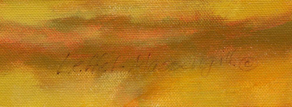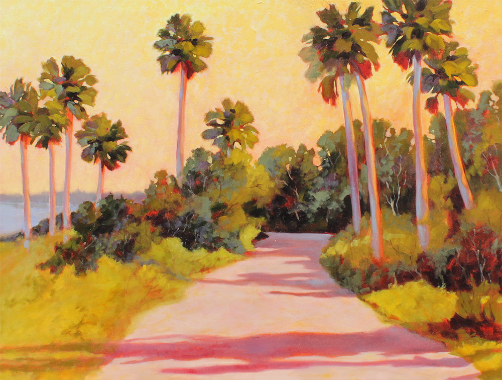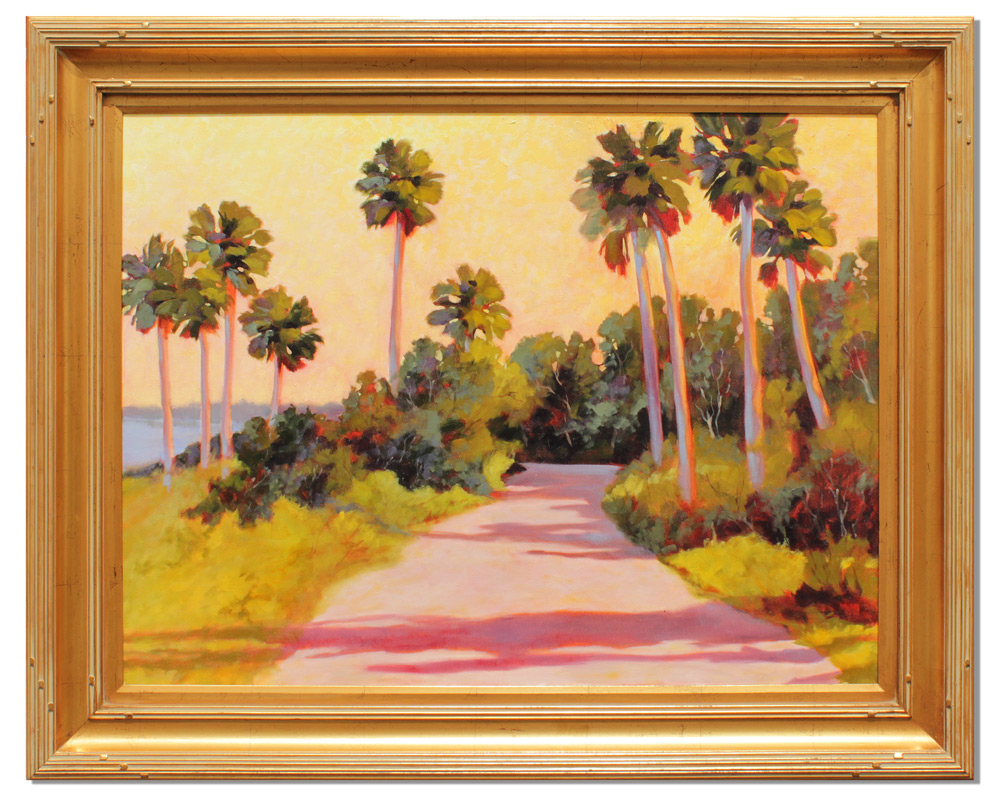 LEFFEL-MASSENGILL, Karen, (American, 20th Century): ''My Soft Place to Fall'', Florida Landscape with Palm Lined Road, Oil/Canvas, 30'' x 40'', signed lower left, encased in carved and gilded fine framing 40'' x 50'', titled verso.