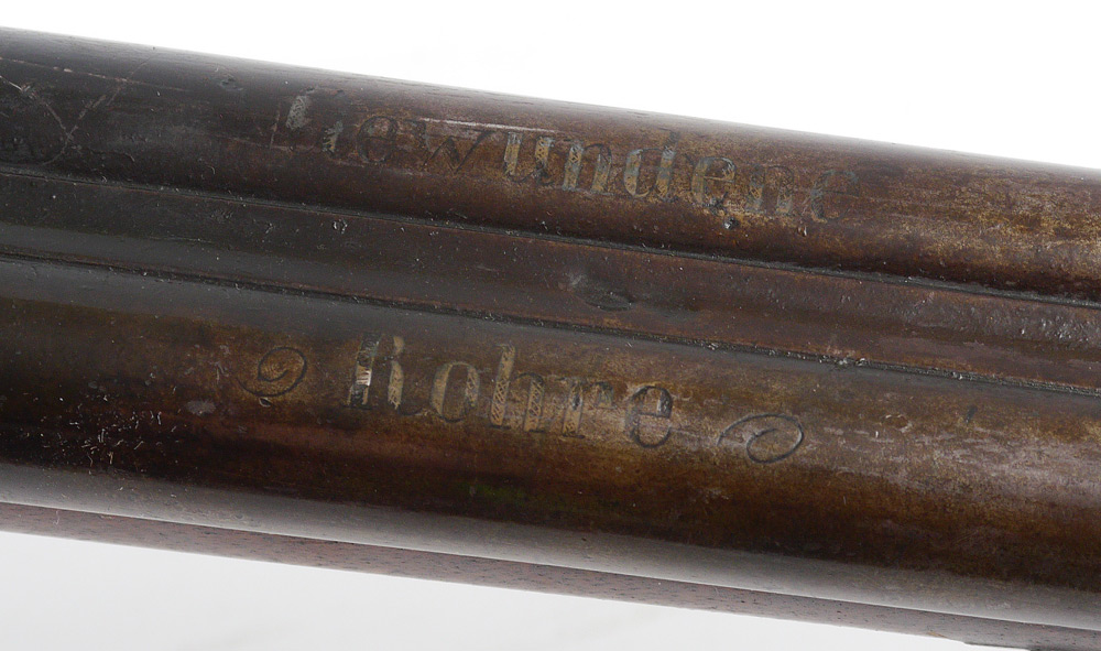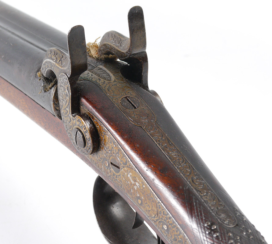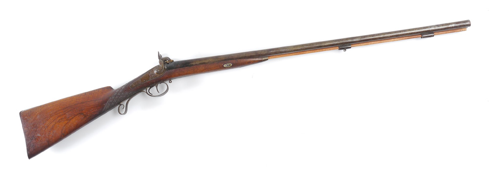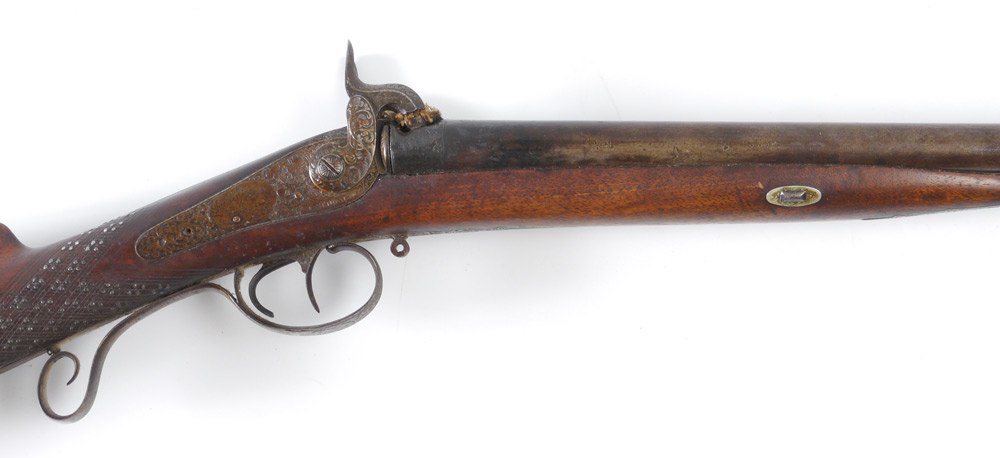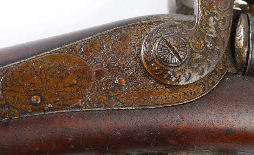 GERMAN DOUBLE BARREL PERCUSSION SHOTGUN: Side by side 30 1/2'' barrel marked on top Gewundene Rohre, engraved percussion lockplates with foliate scroll and stag decoration marked F. Schoning in Osnabruck. Checkered walnut stock with applied decoration, engraved trigger guard and top of butt plate. Action currently works, overall 48'' long.
