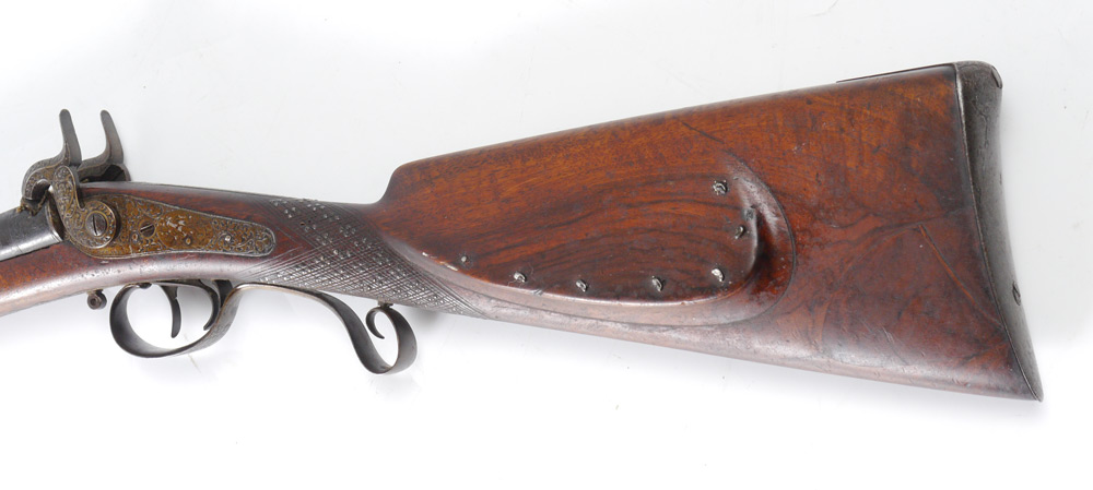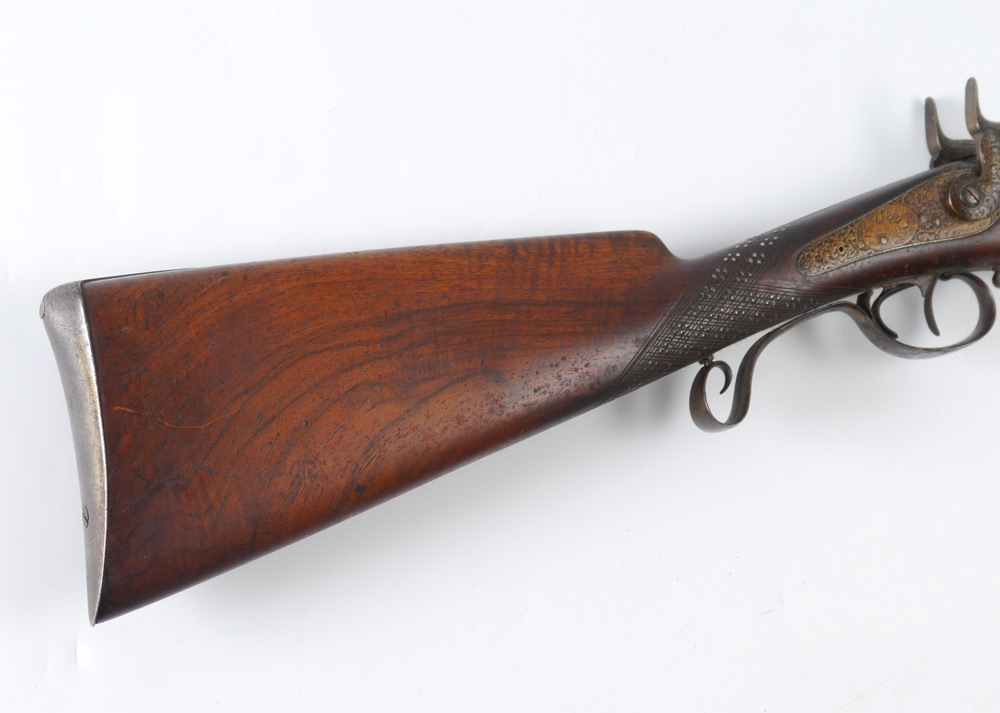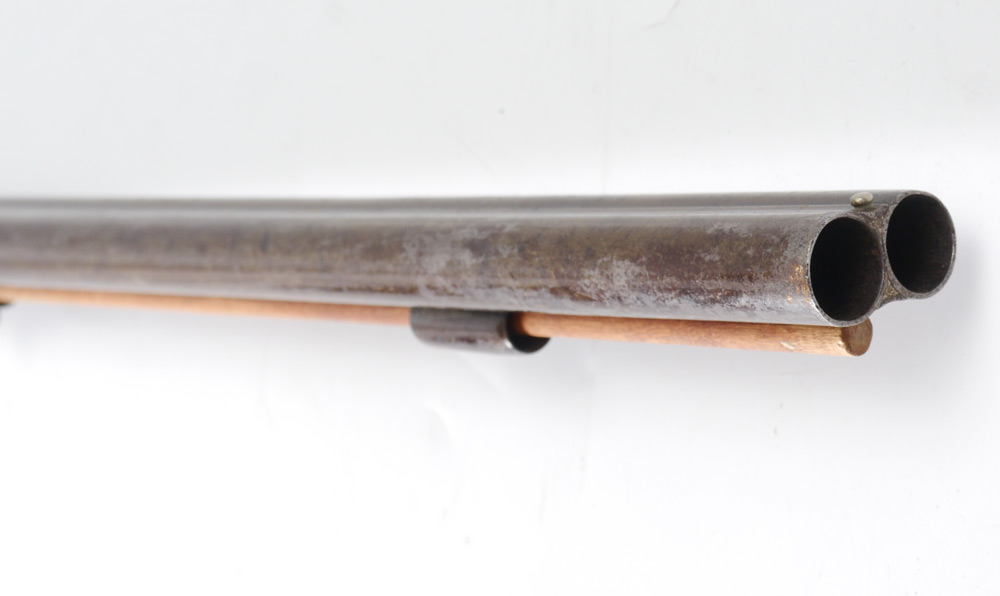 CONDITION: Scratches to stock, possibly had a piece of decoration stock now missing. Barrels and lockplate have been lacquered. BURCHARD GALLERIES DOES NOT ENDORSE THE FIRING OF ANY ANTIQUE FIREARM.