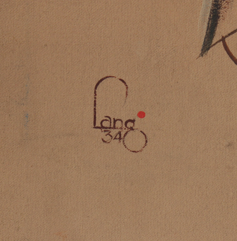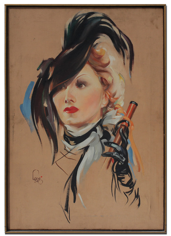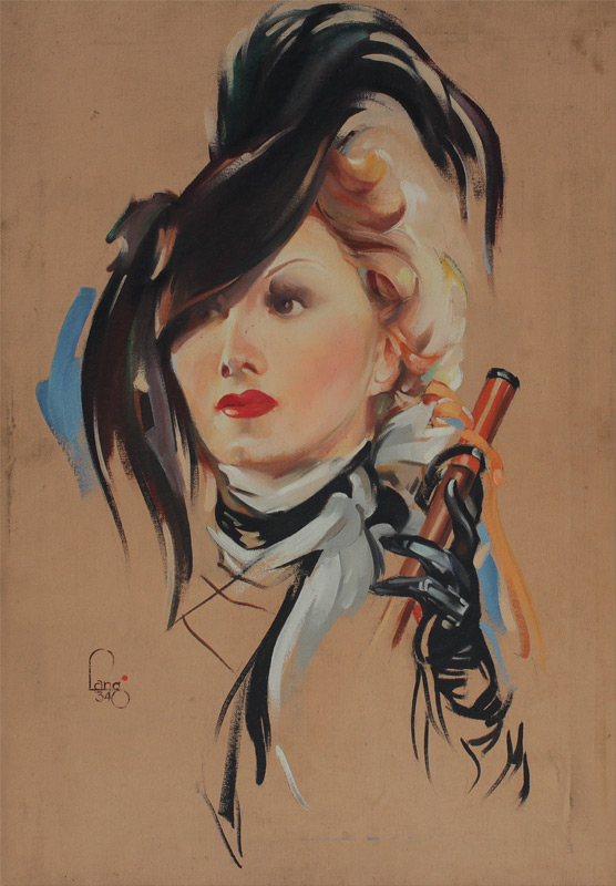 FEMALE BEAUTY ILLUSTRATION PAINTING SIGNED LANG DATED 1934: Portrait of a Young Blonde Wearing a Hat Holding Either a Parasol or Crop, Oil/Canvas, 28'' x 20'', signed lower left, thin edge wood frame 29'' x 20 1/2''.