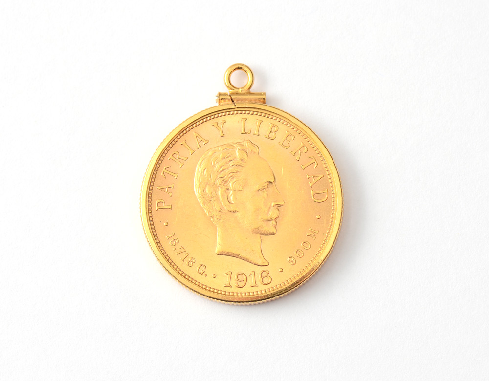 1916 CUBAN DIEZ PESOS GOLD COIN IN BEZEL: .900 gold coin, 1916 Republica De Cuba in 14K yellow gold pendant bezel. Approx. 16.7 grams .900 gold, 1.5 grams 14k gold. Ungraded.