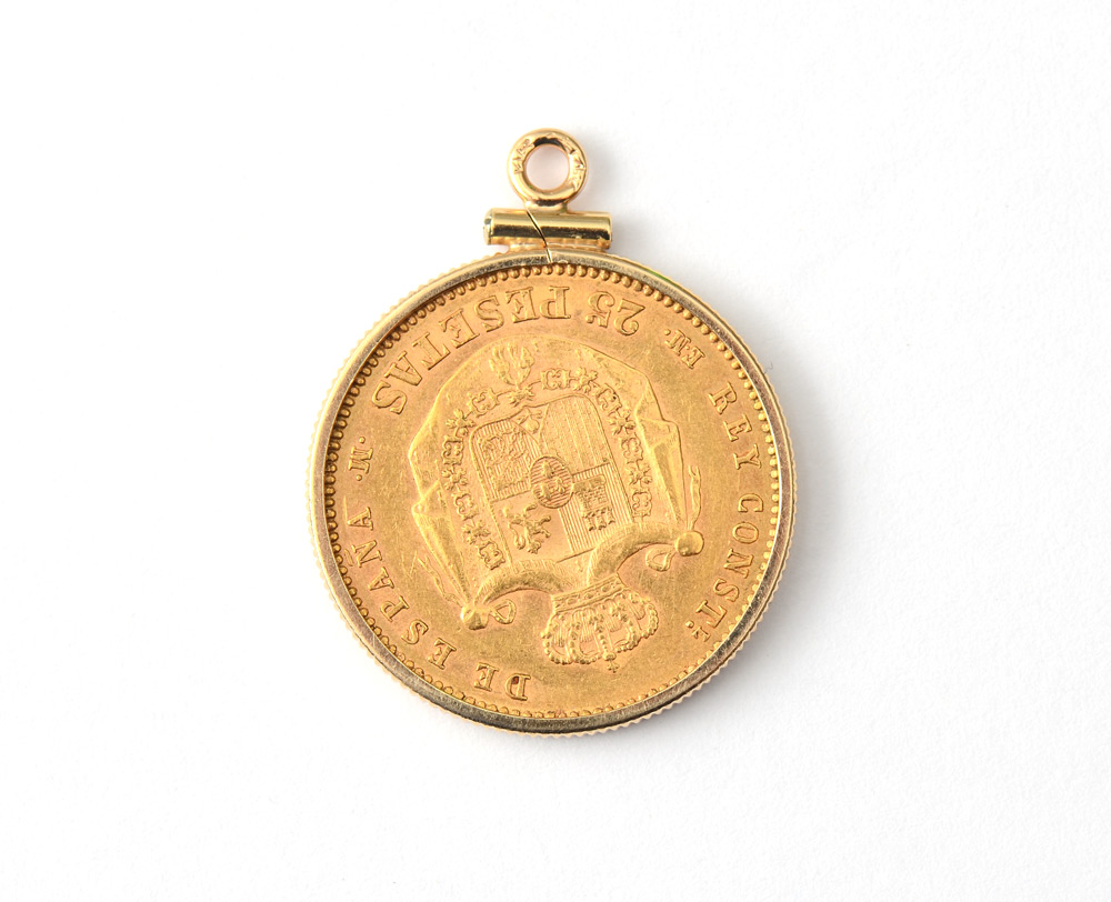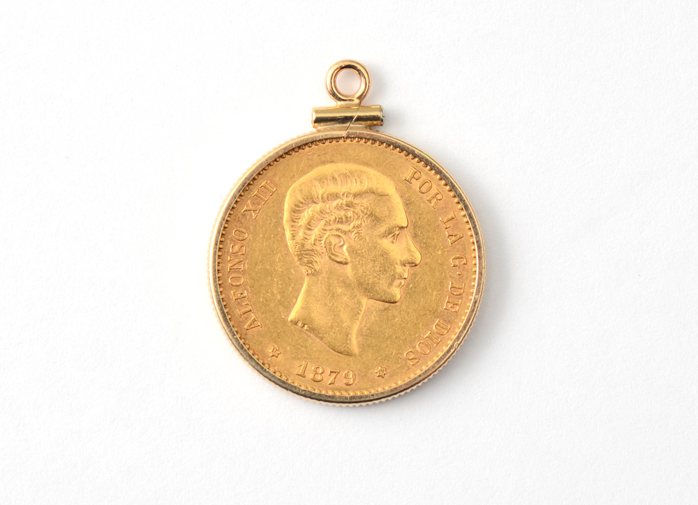 1879 SPANISH 25 PESETAS GOLD COIN IN BEZEL: .900 gold coin, 1879 Espana in 14k gold pendant bezel. Approx. 8 grams .900 gold, 1.3 grams 14k. Ungraded.