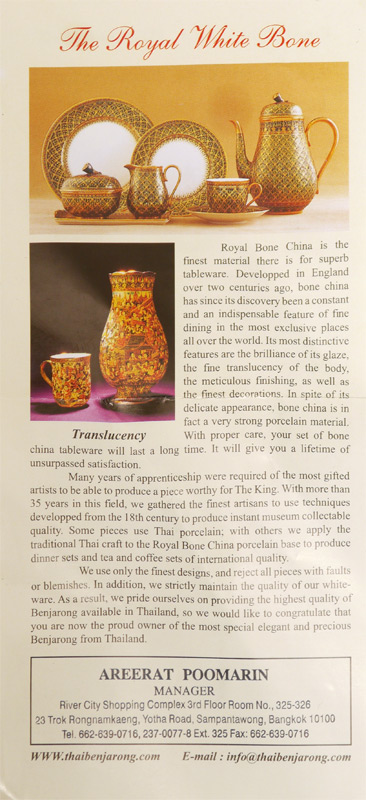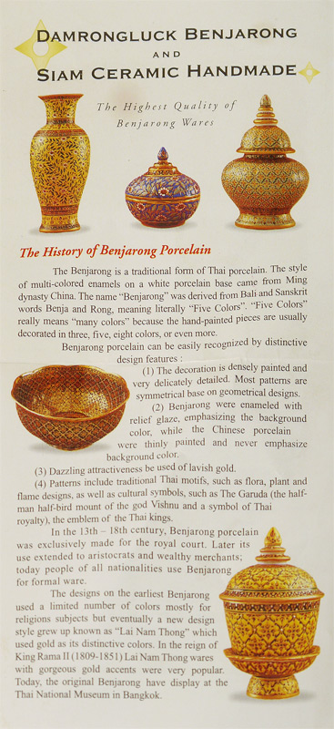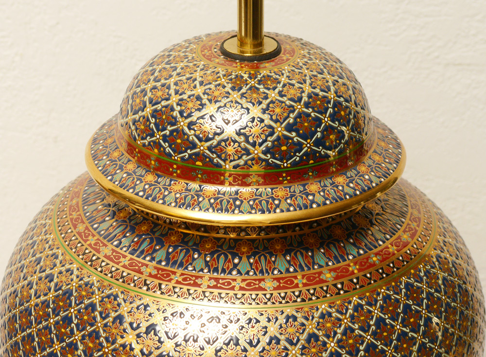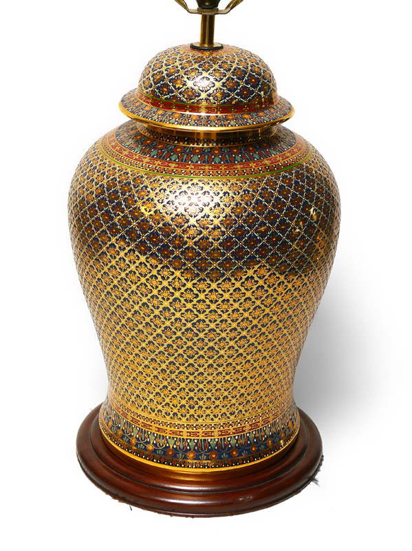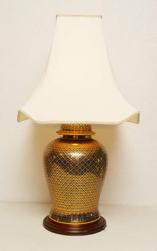 BENJARONG THAI PORCELAIN LAMP: Densely and delicately painted porcelain body on wood base, single socket fixture, overall measures 29 3/4'' h. x 9 1/2''. Sold with a cloth shade, 15'' h. x 16 1/2'' square.