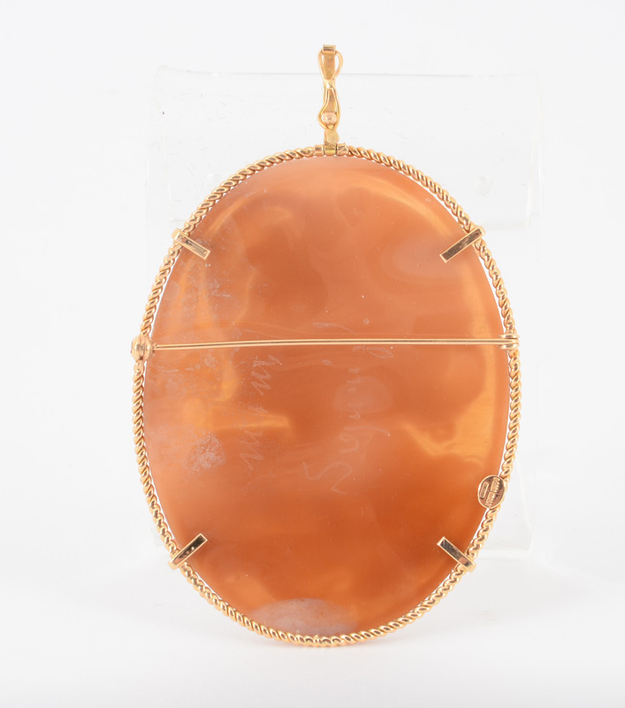 LARGE 14K GOLD FRAMED CAMEO PENDANT / BROOCH: Artist signed carved shell cameo of young girl with bird. 2 1/2'' x 2''.