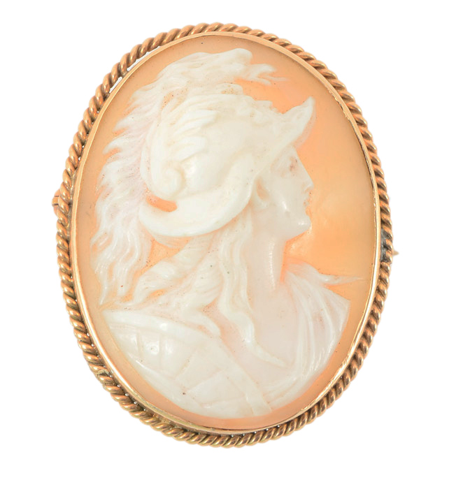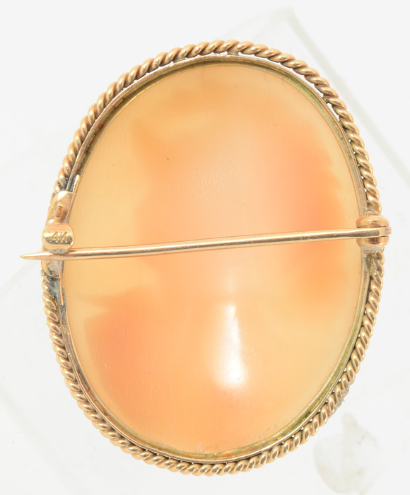 14K GOLD CAMEO PENDANT / BROOCH: Yellow gold framed high profile carved shell cameo of a Roman soldier. 1 1/2'' x 1 1/4''.