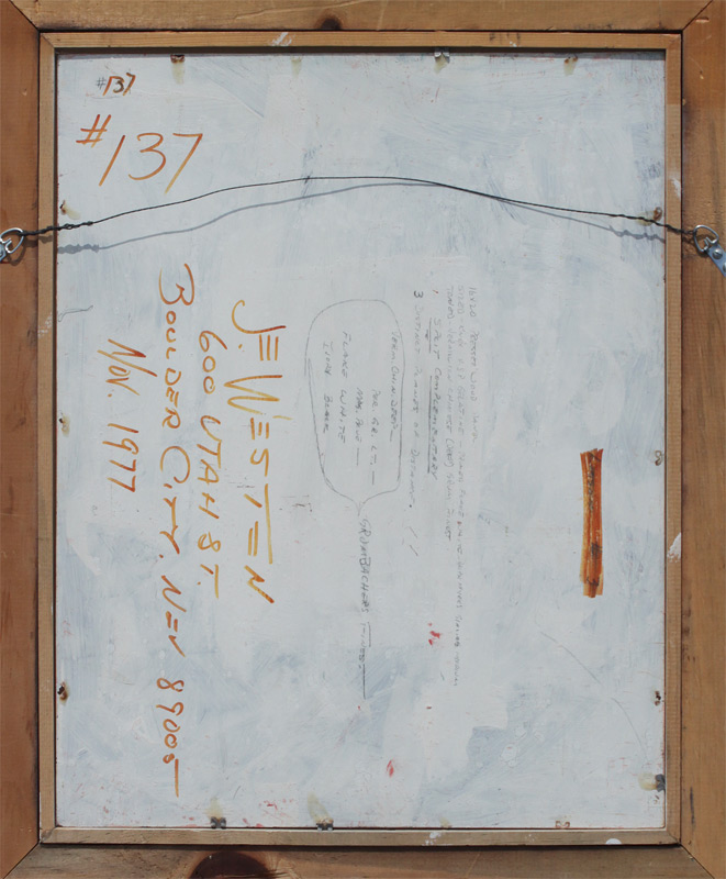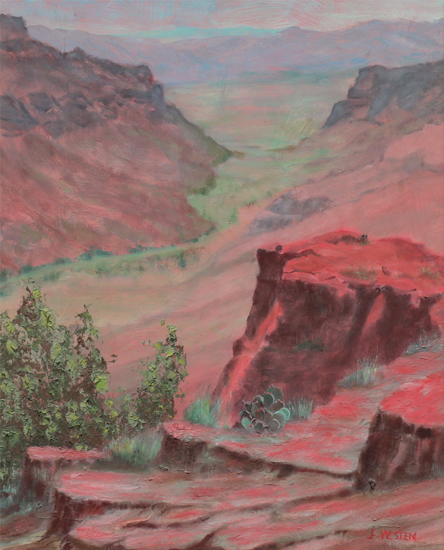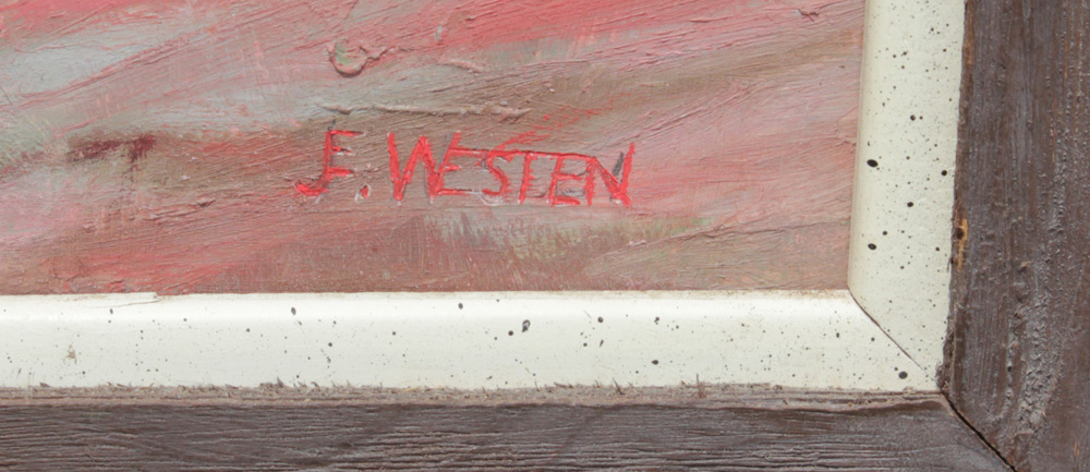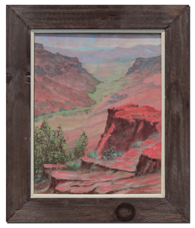 J. WESTEN WESTERN CANYON LANDSCAPE PAINTING: Oil/Board, 20'' x 16'', signed lower right, signed verso, painted barn wood frame 26 1/2'' x 22 1/4''.