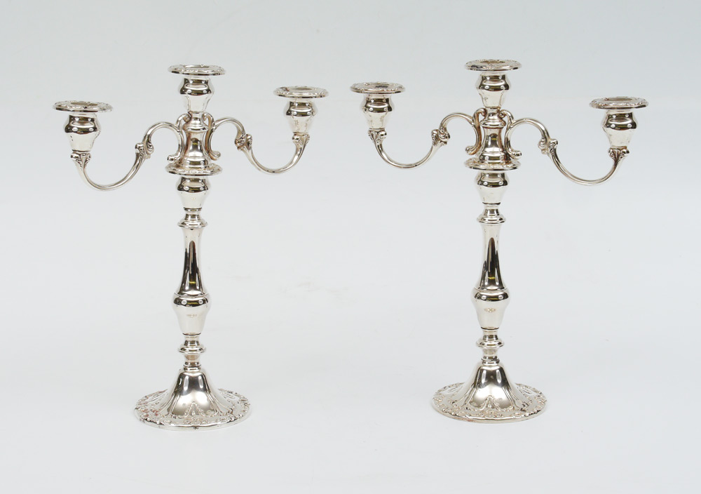 GORHAM STERLING SILVER CANDELABRA: Pair 3 light candlesticks, convertible to single light, embossed foliate motif base, marked on base. Weighted sterling, overall measures 13'' h. x 11 1/2''.