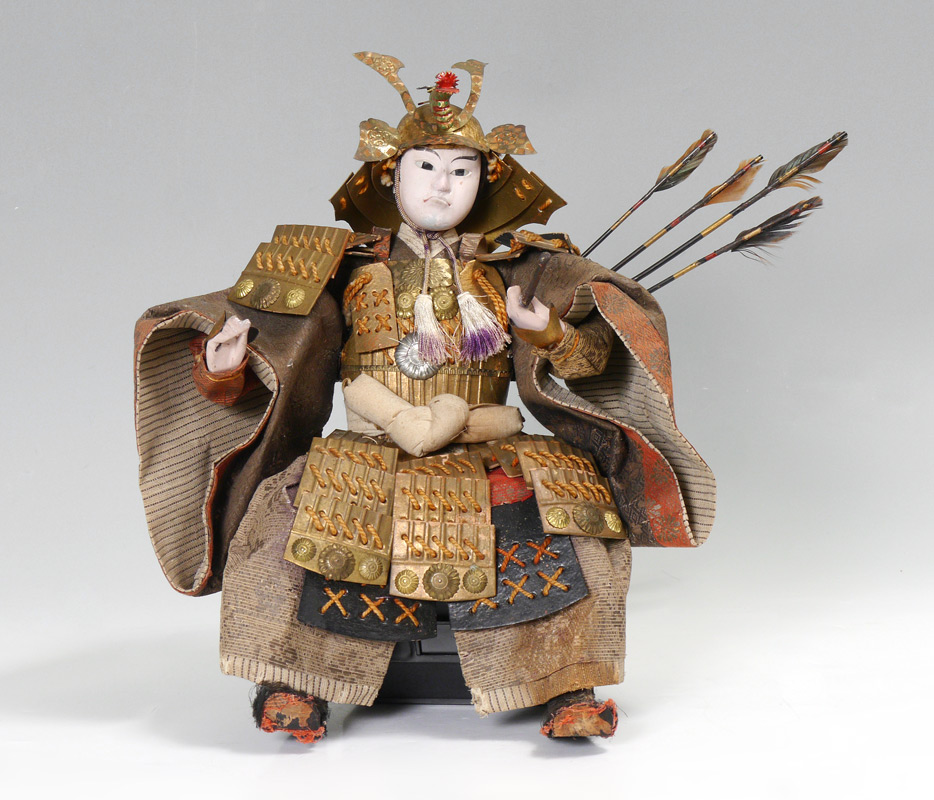 EDO PERIOD JAPANESE SAMURAI DOLL: Edo Period (c. 1800- 1886) Japanese samurai doll, or musha ningyo, made for display on Boy's Day which is celebrated annually in Japan on May 5. This seated samurai has wonderful detailing in the cotton and silk brocade costume, and is rendered in full armor with yoroi and kabuto. The samurai has an expressive gofun face, and accessories include a quiver with four arrows. Overall 18 1/4'' h. x 16'' x 9 1/2''.