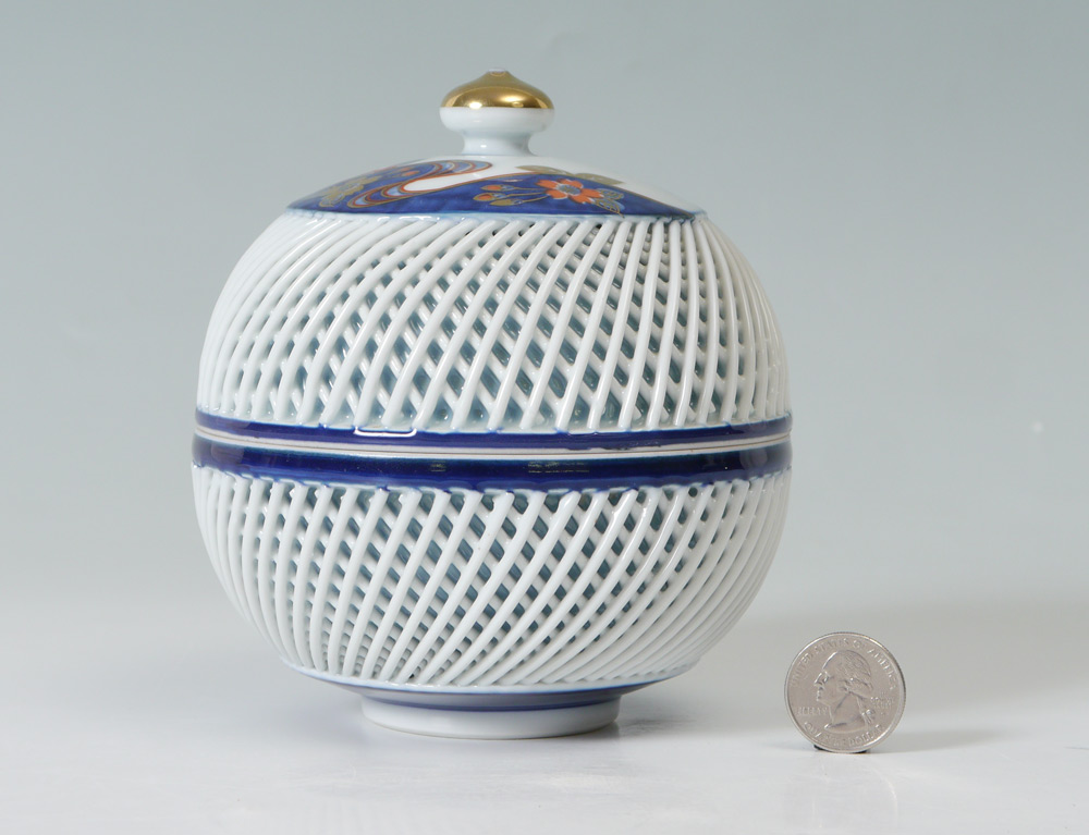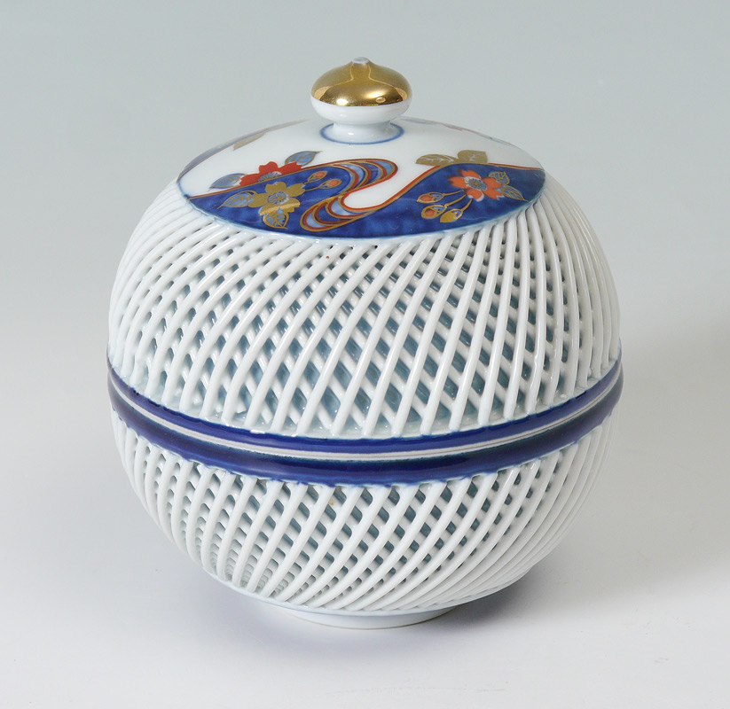JAPANESE IMARI RETICULATED COVERED JAR: Signed Hirado, top with Imari decoration, both with applied reticulated decoration. Overall measures 5 1/4'' h. x 5'' dia.
