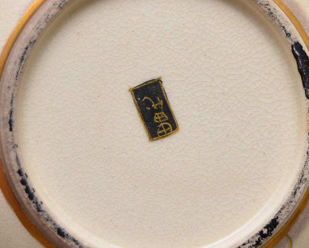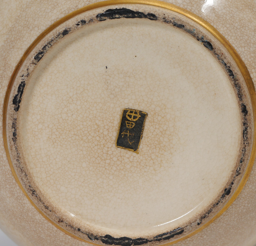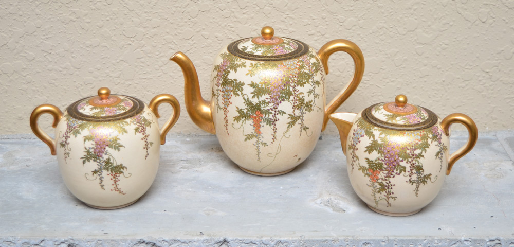 3 PIECE JAPANESE SATSUMA TEA SET: Hand painted Satsuma tea set, complete with teapot (5 1/2'' h. x 7 1/2''), sugar and creamer, all with original knobbed lids. The bodies have a pleasing, plump ovoid form and the hand painting is exquisitely detailed with gilt and colorful enamels in a wisteria motif. The purple and orange wisteria spill from the lids to the bodies of the serving pieces in a continuous motif. A black and gold geometric design bands the rims and lids, making a striking border to frame each piece.