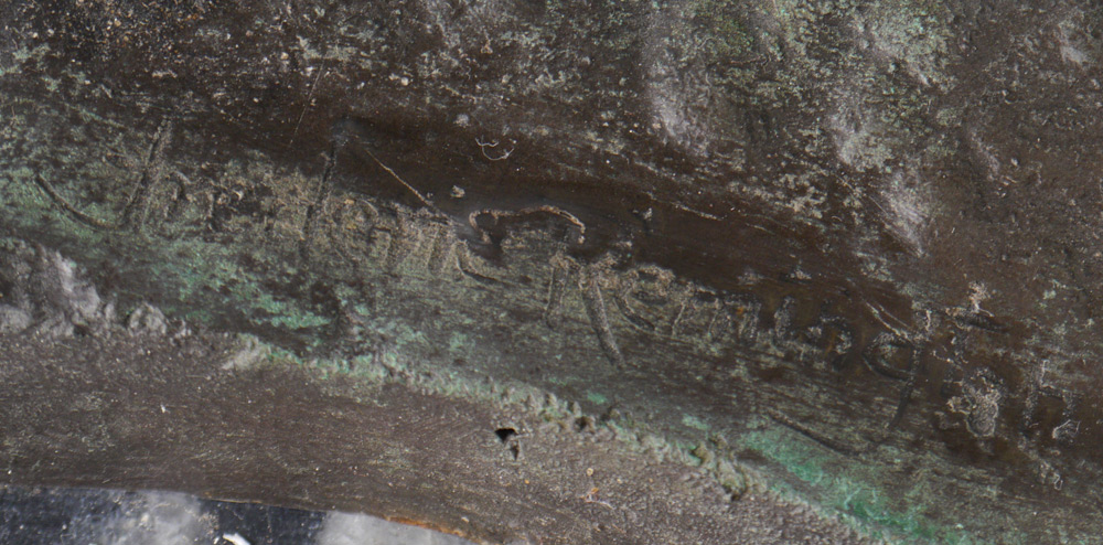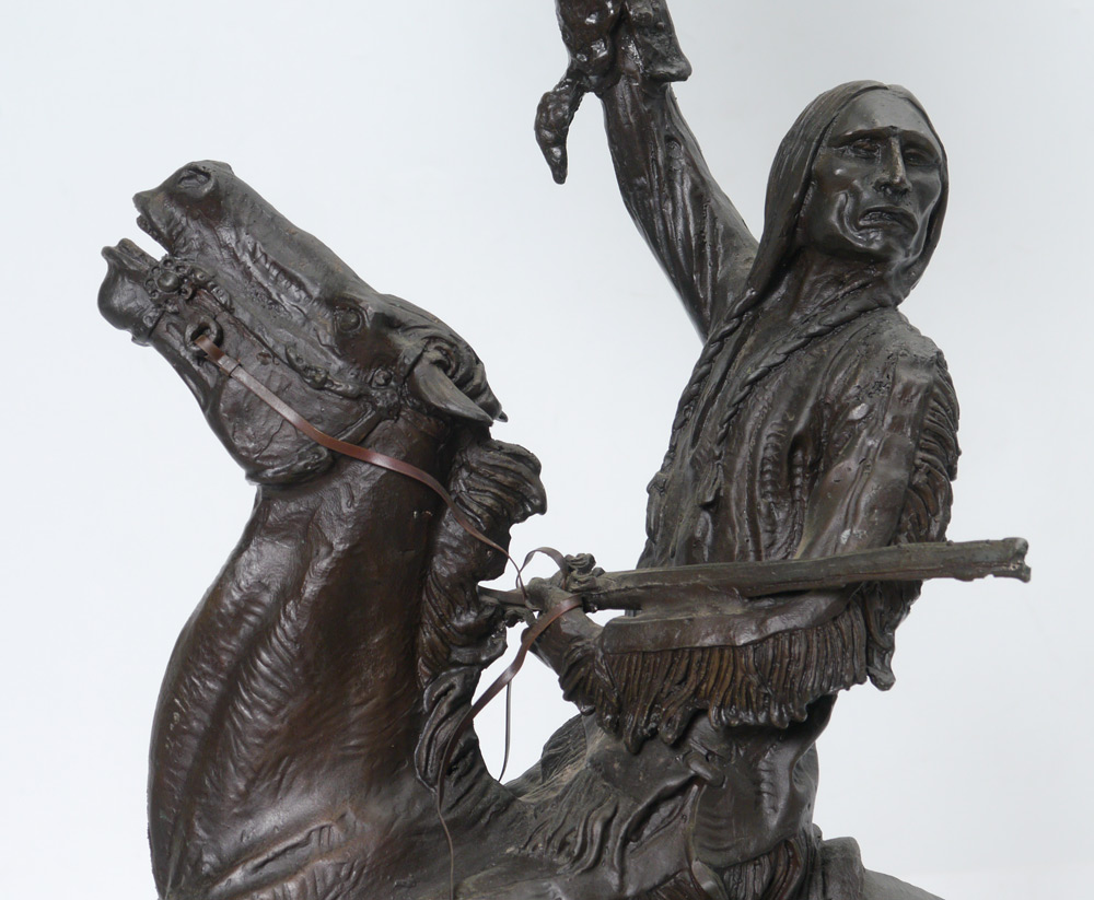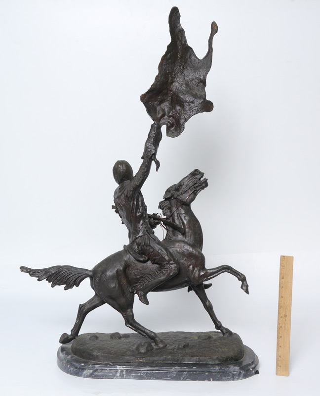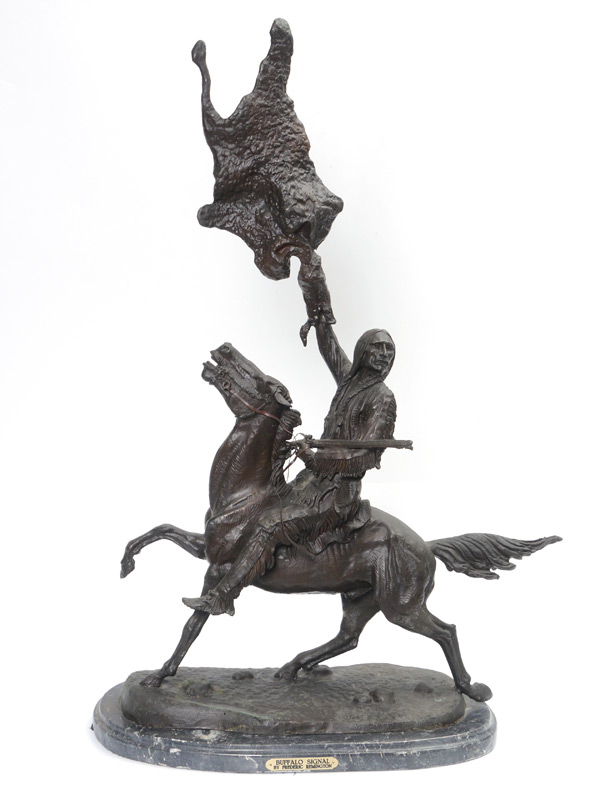 BRONZE BUFFALO SIGNAL SCULPTURE AFTER REMINGTON: 35'' h. x 21'' w. x 12'', affixed to beveled black marble plinth, 36'' overall.