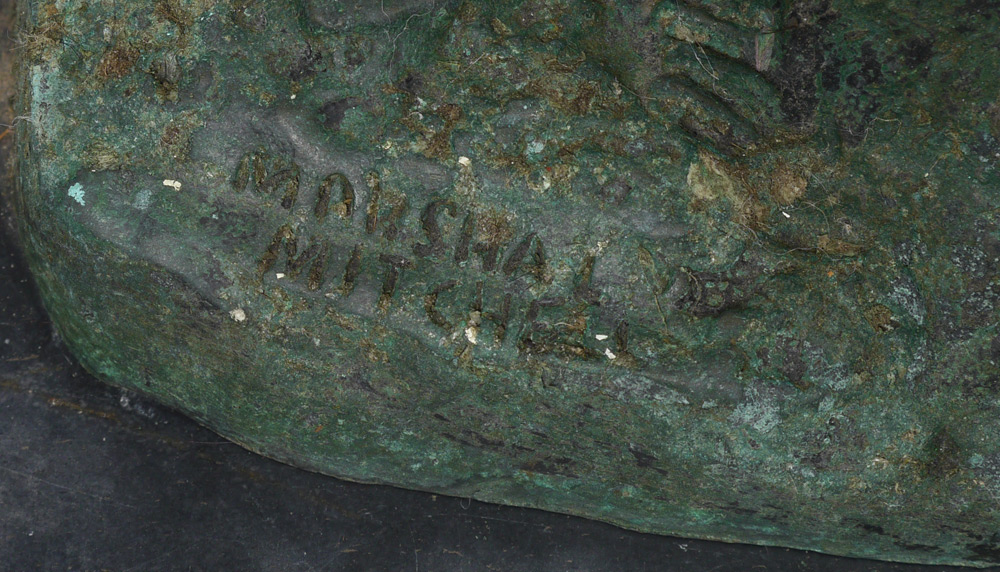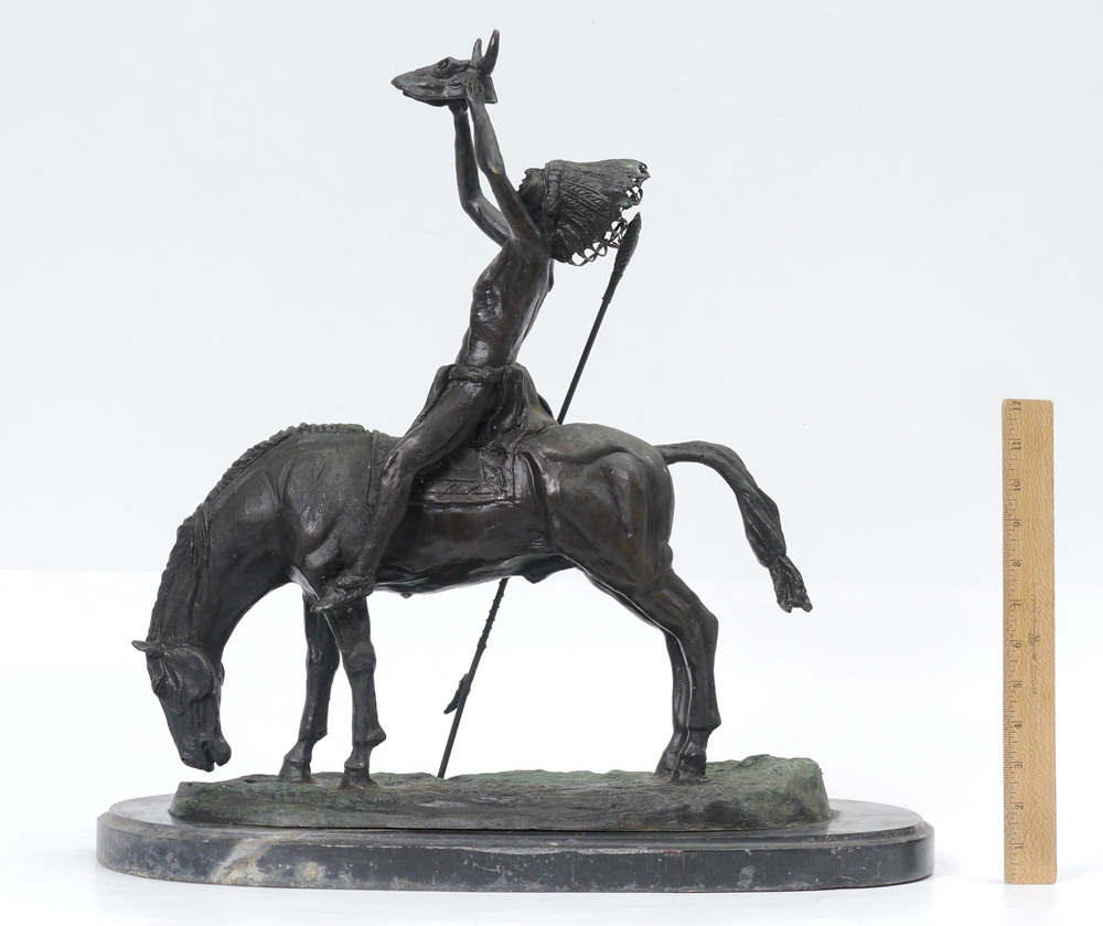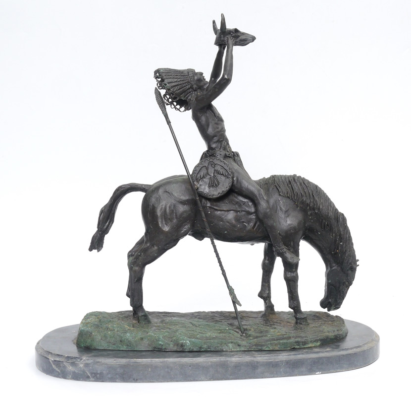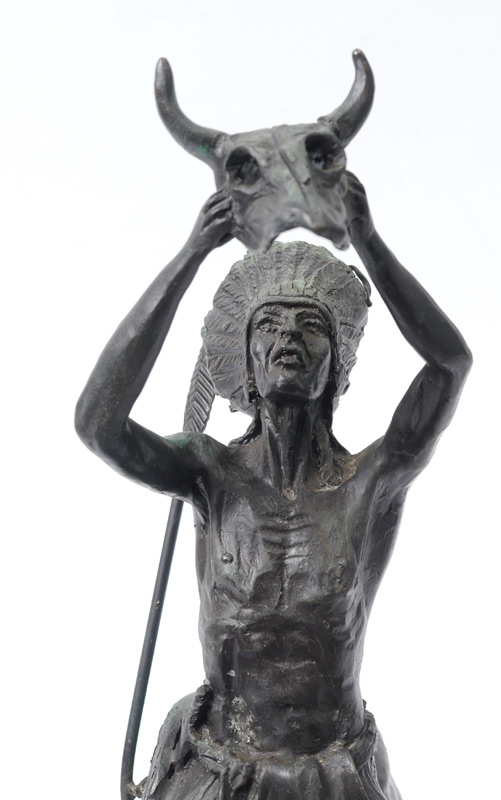 INDIAN CHIEF BRONZE SIGNED MARSHAL MITCHELL: Depicts Indian Chief on Horseback Holding a Cow Skull to the Sky Praying for Guidance, 20 1/4'' h. x 21'' w. x 9'' d., affixed to a beveled marble plinth, 22'' overall.
