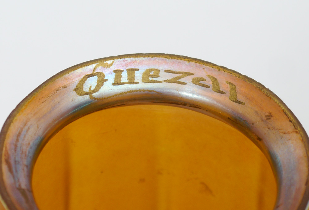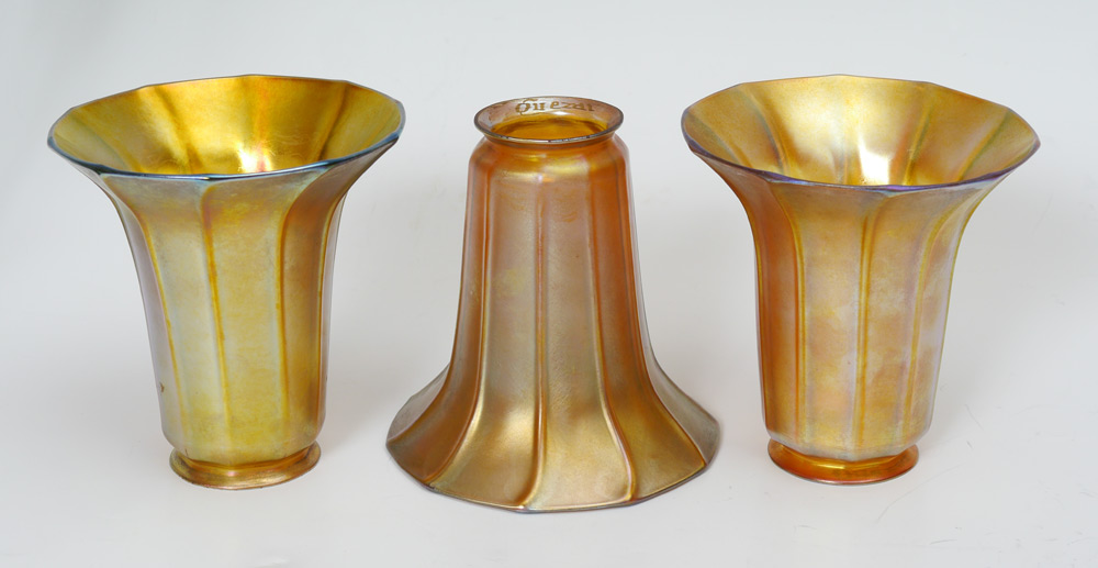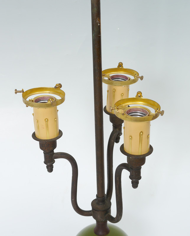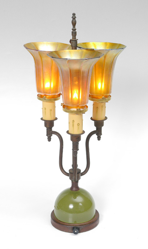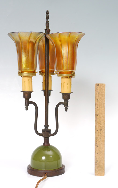 3 LIGHT PARLOR LAMP WITH QUEZAL SHADES: Table lamp with rounded green glass over metal base, 3 arms with central rod which can be adjusted up. Each socket supports a signed ribbed Quezal iridescent art glass shade. Lamp overall 22'' h. x 6'', shades 5 1/4'' h. x 5 1/8'' with a 2 1/4'' fitter rim.