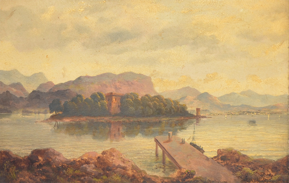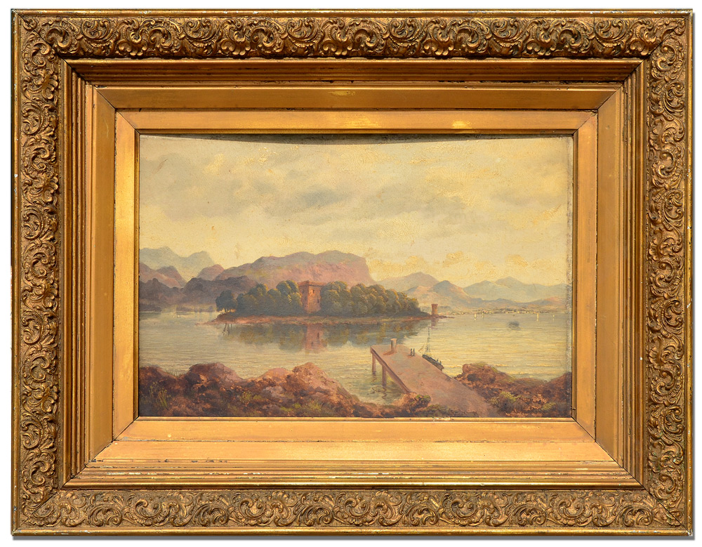 19TH CENTURY LOCH LEVEN CASTLE PAINTING: Oil/Cardboard, 12'' x 18'', signed lower left Clarke, dated 1893, titled in the back, period frame 21'' x 26 3/4''.