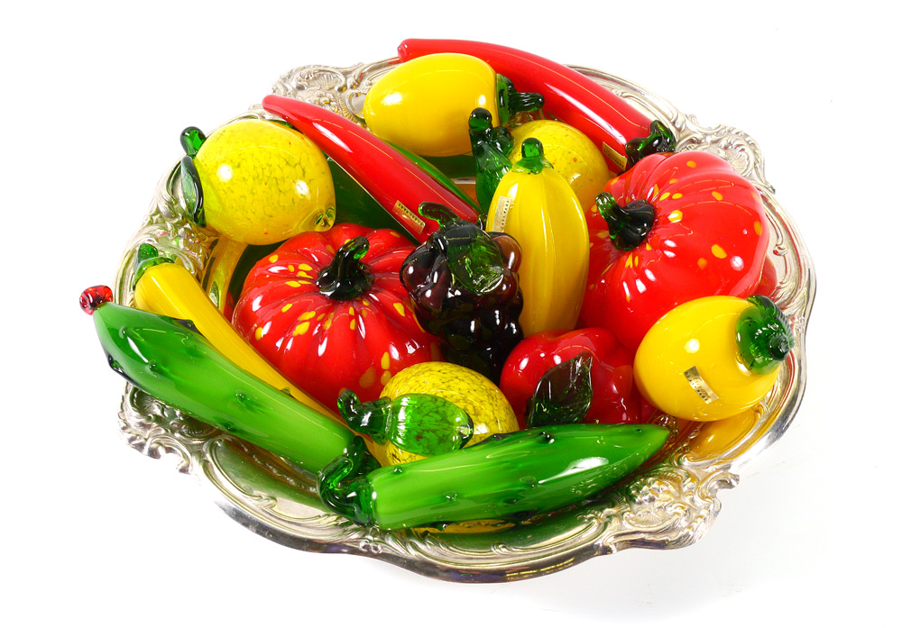 COLLECTION OF GLASSWARE FRUIT & VEGETABLES: 17 assorted fruits and vegetable, each with Murano Glassware paper label. Sold in a silverplate bowl, 2'' h. x 14 1/4'' dia.