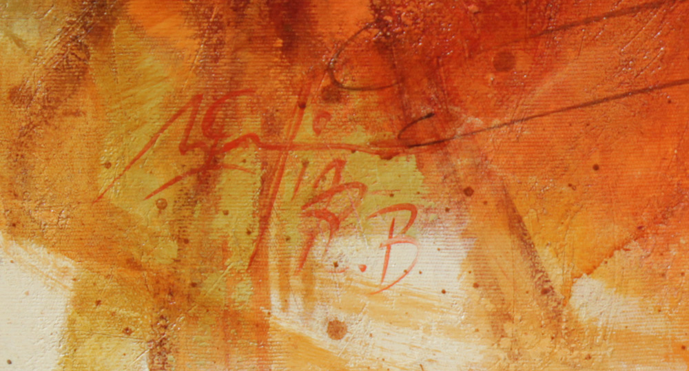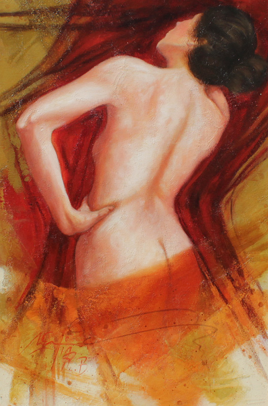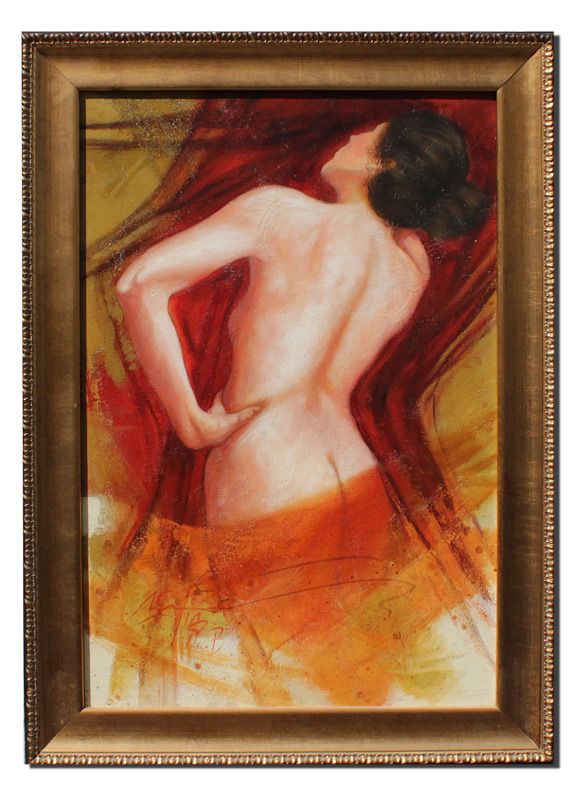 ILLEGIBLY SIGNED NUDE PAINTING: Oil/Canvas, 36'' x 24'', signed lower left, Raul Mercier Fine Arts label affixed verso with title in Spanish ''Personaje en Rojo I'', fine custom framing 42'' x 30''.