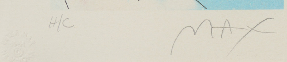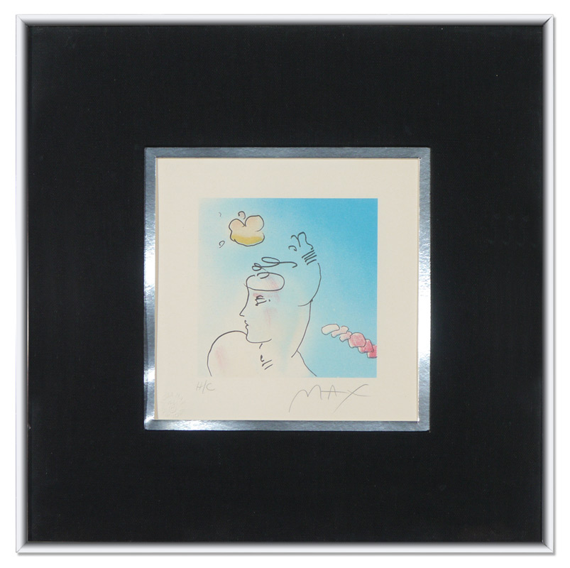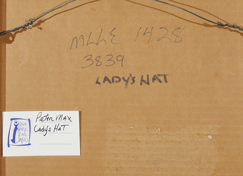 MAX, Peter, (German, 1937- ): Ladies Hat, Color Lithograph, Sight size 6 1/2'' x 6 1/2'', pencil signed lower right, marked H/C lower left with Peter Max New York Blind Stamp, 1981, metal frame 13 1/2'' x 13 1/2''.