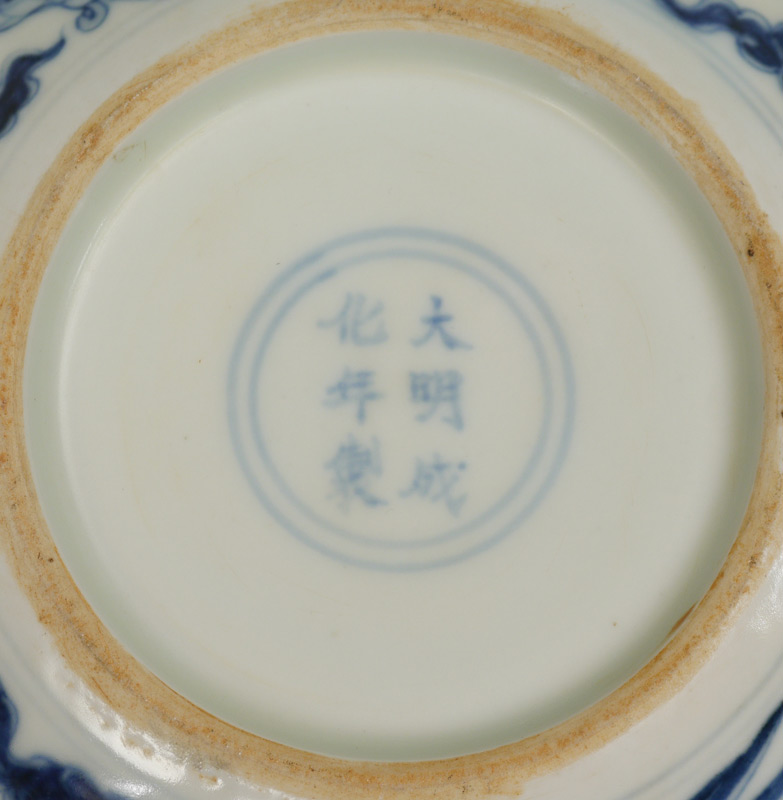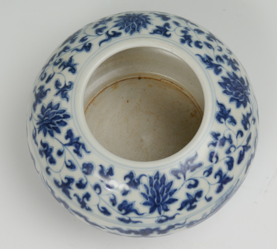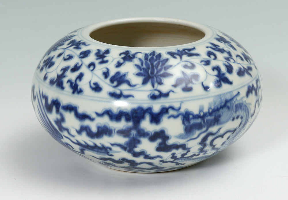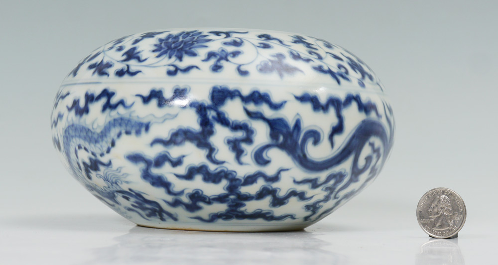 CHINESE BLUE & WHITE DRAGON POT: Blue and white decoration with floral motif top rim. Spurious Qing dynasty marks on base. Measures 3 7/8'' h. x 7 1/4''.
