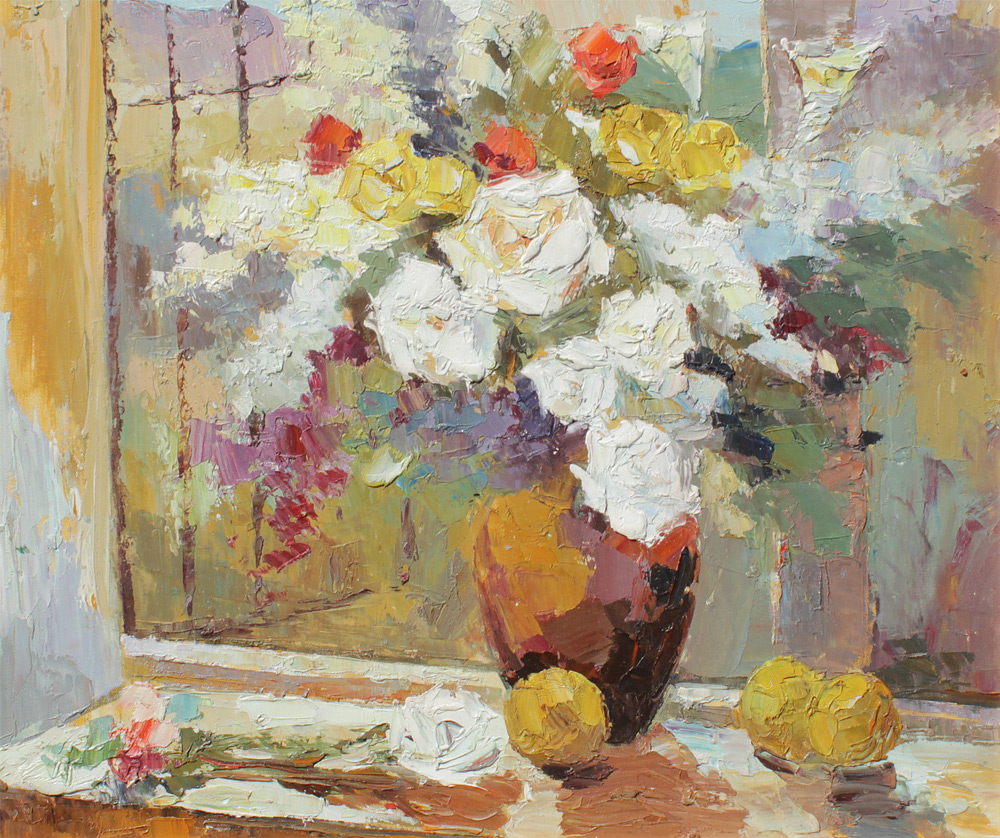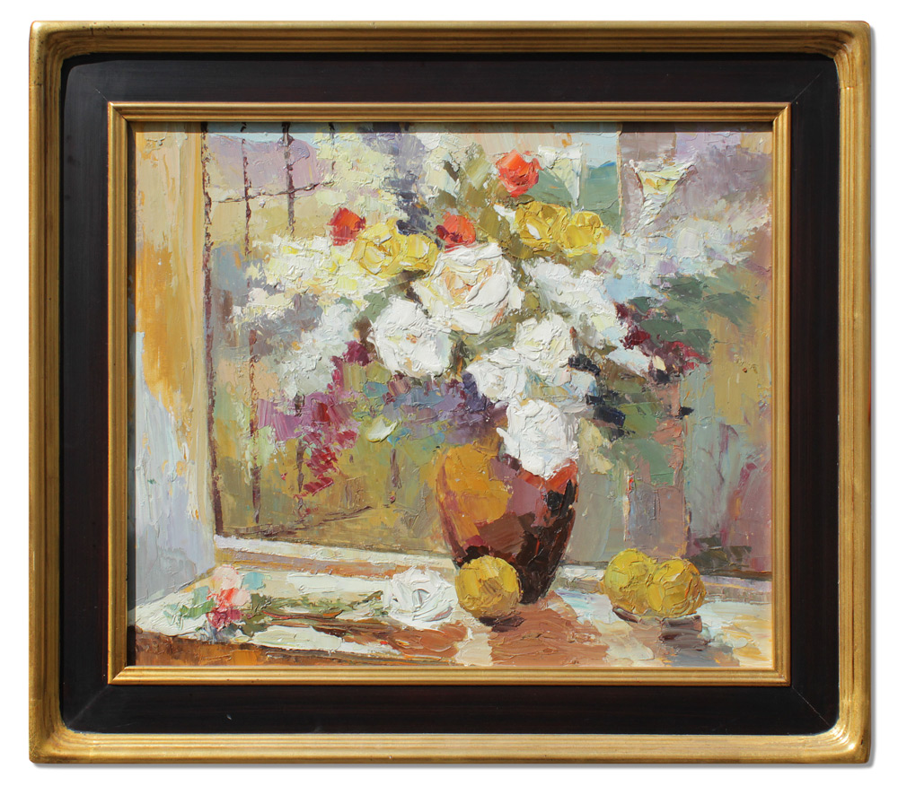 FINE CONTEMPORARY FLORAL STILL LIFE PAINTING: Oil/Canvas, 20'' x 24'', no visible signature, encased in finely finished gilded and ebonized frame 26'' x 30''.