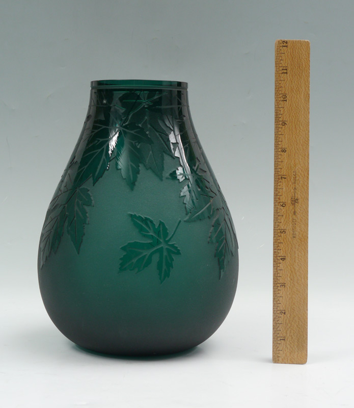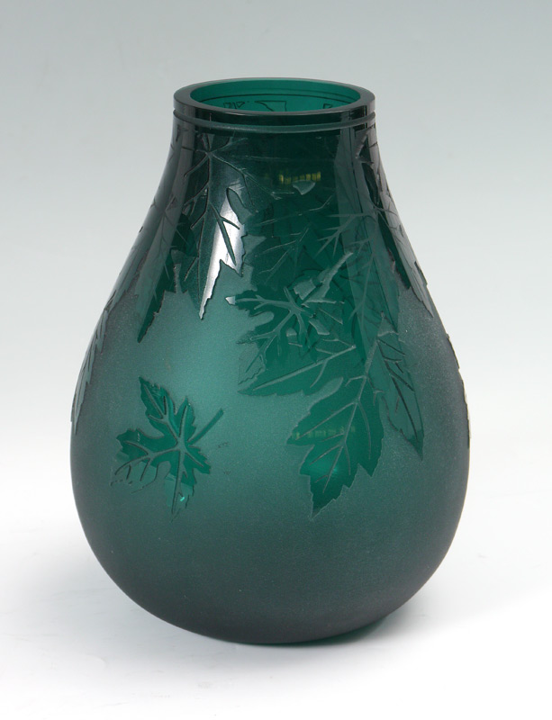 SIGNED PILGRIM CAMEO GLASS VASE: Green glass vase with leaf designs, signed on base and dated 1992.