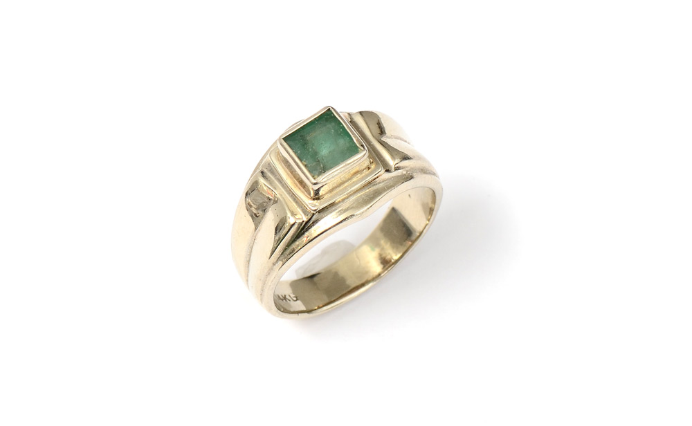 LADIES OR MAN'S EMERALD RING: 14K white gold ring centers a 1.00 Ct solitaire square faceted emerald. Rated SI in clarity (Type III), G in Hue, 3 in Tone and 2-3 in Saturation. The emerald is bezel set. Weight: 7.5 grams. Size: 8.5