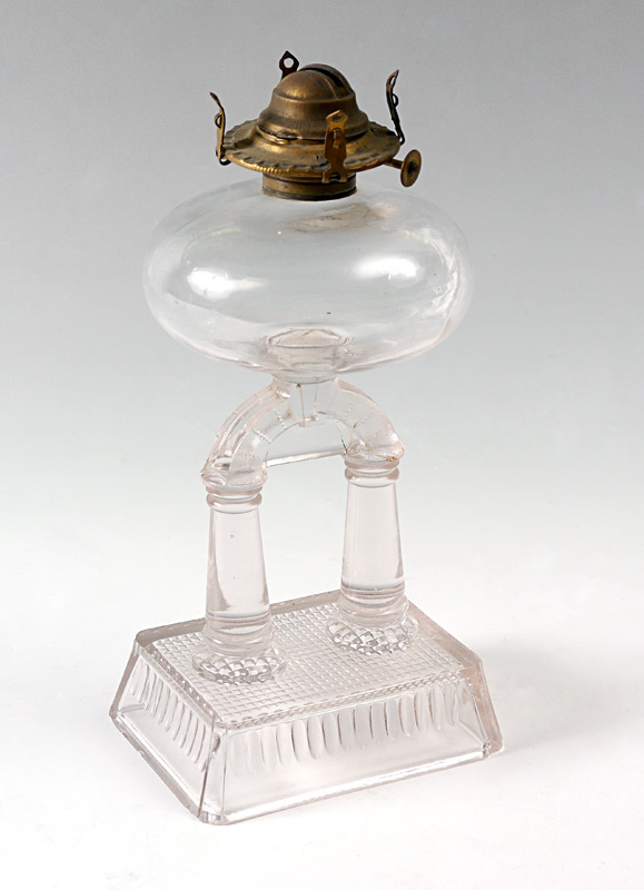 FINDLAY TWO POST STAND LAMP: Rare two post oil lamp, 10'' to collar x 5'' x 3 3/8''.