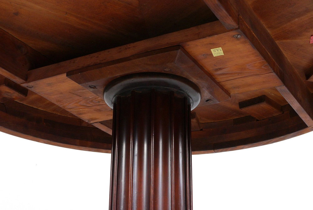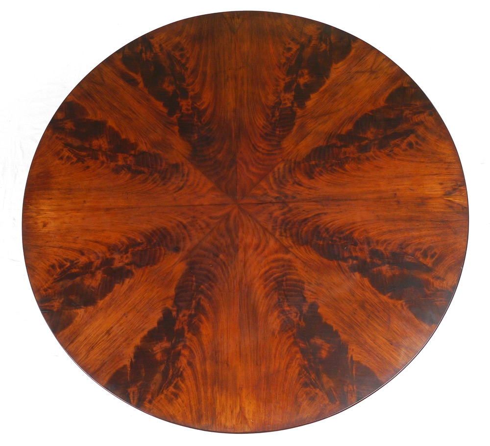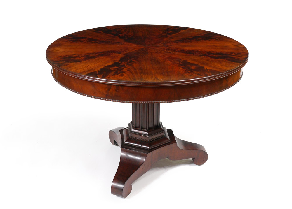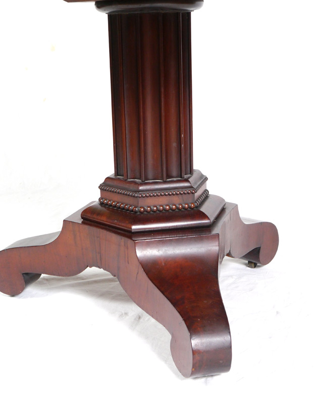 EMPIRE MAHOGANY ROUND TABLE: Flame mahogany veneer top, fluted pedestal base on 3 splayed feet. 28 3/4'' x 40 3/4''.