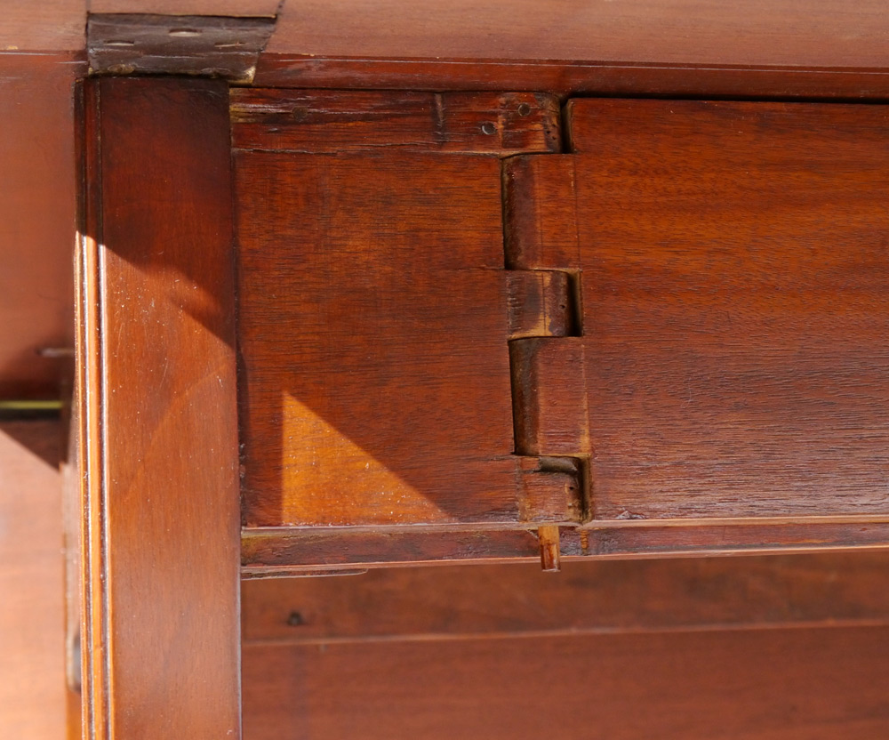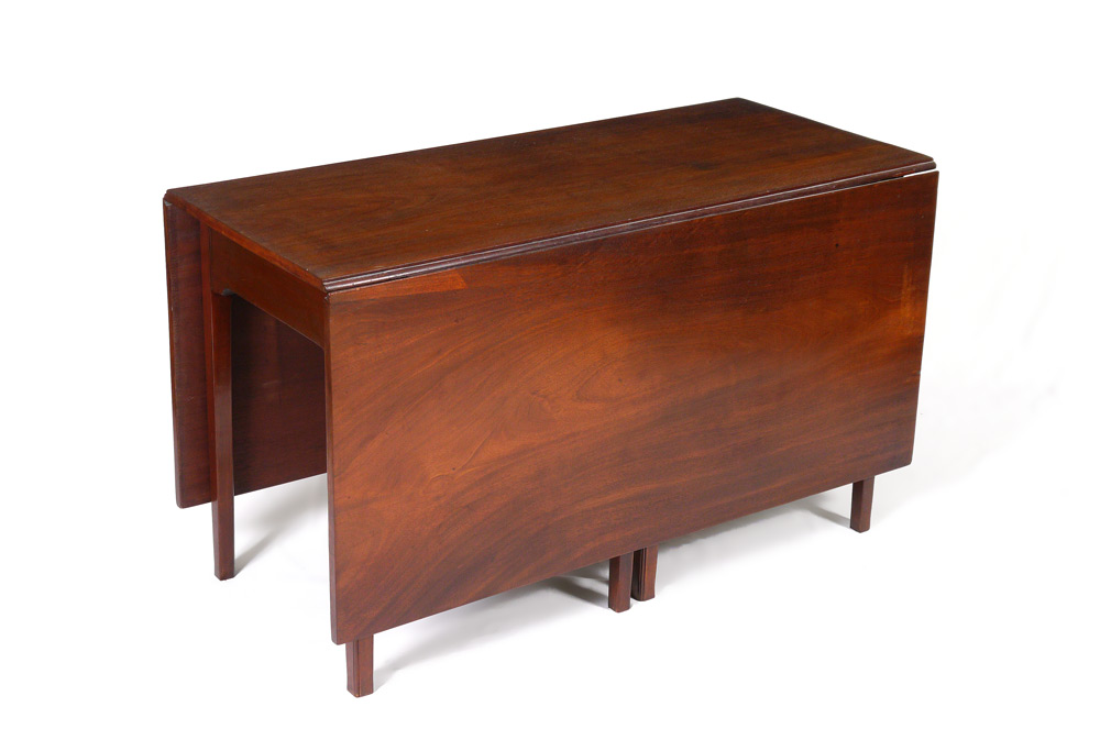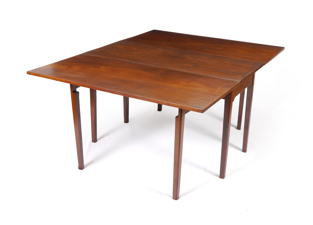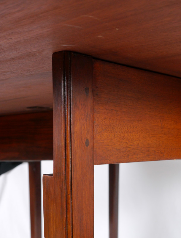 MAHOGANY DROP LEAF DINING TABLE: Pegged construction with 8 legs, 28 3/4'' h. x 49 1/4'' x 22 1/4'' with leaves down, each leaf 22 1/2''.