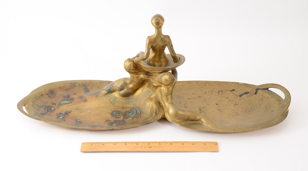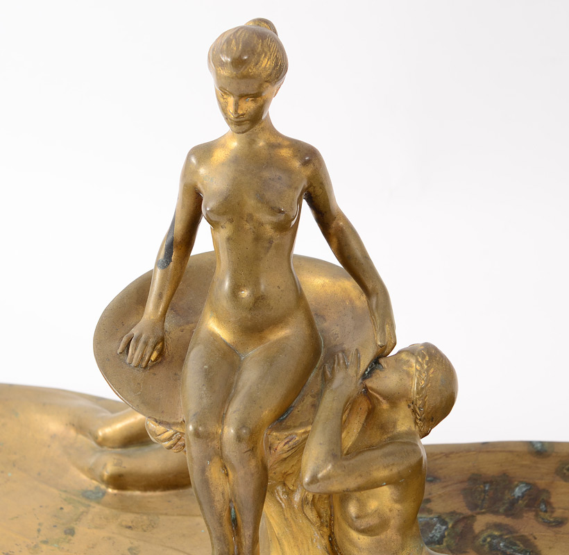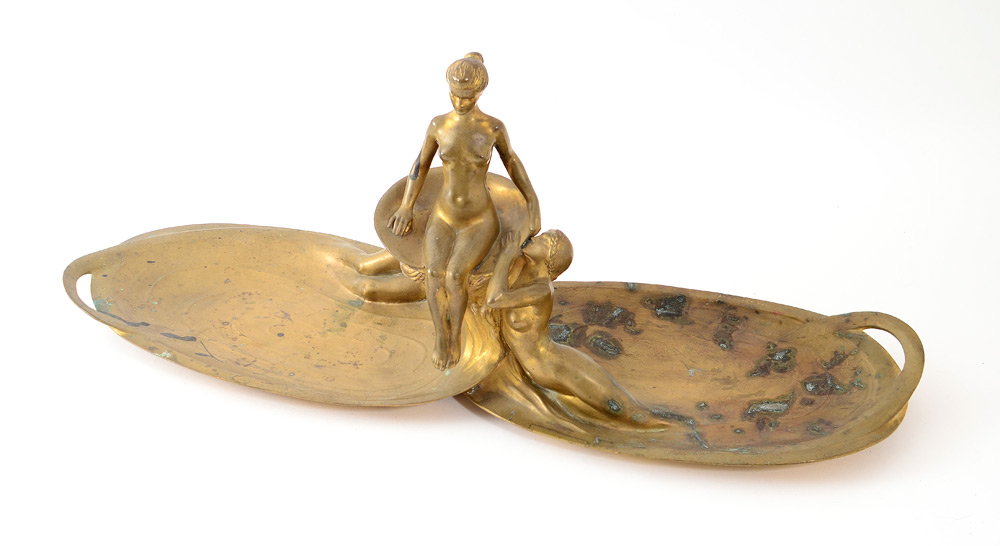 BLONDAT, Max, (French, 1872-1926): Figural Nude Dual Tray, Bronze Centerpiece, 10 1/2'' h. x 26'' w. x 8 1/4'' d., incised signature.