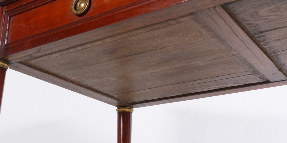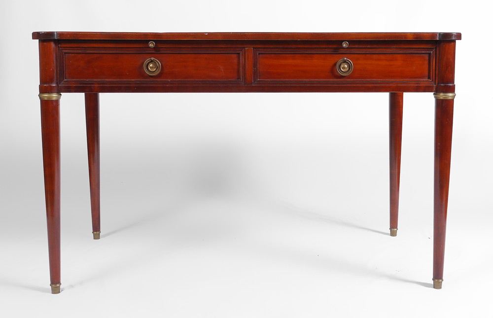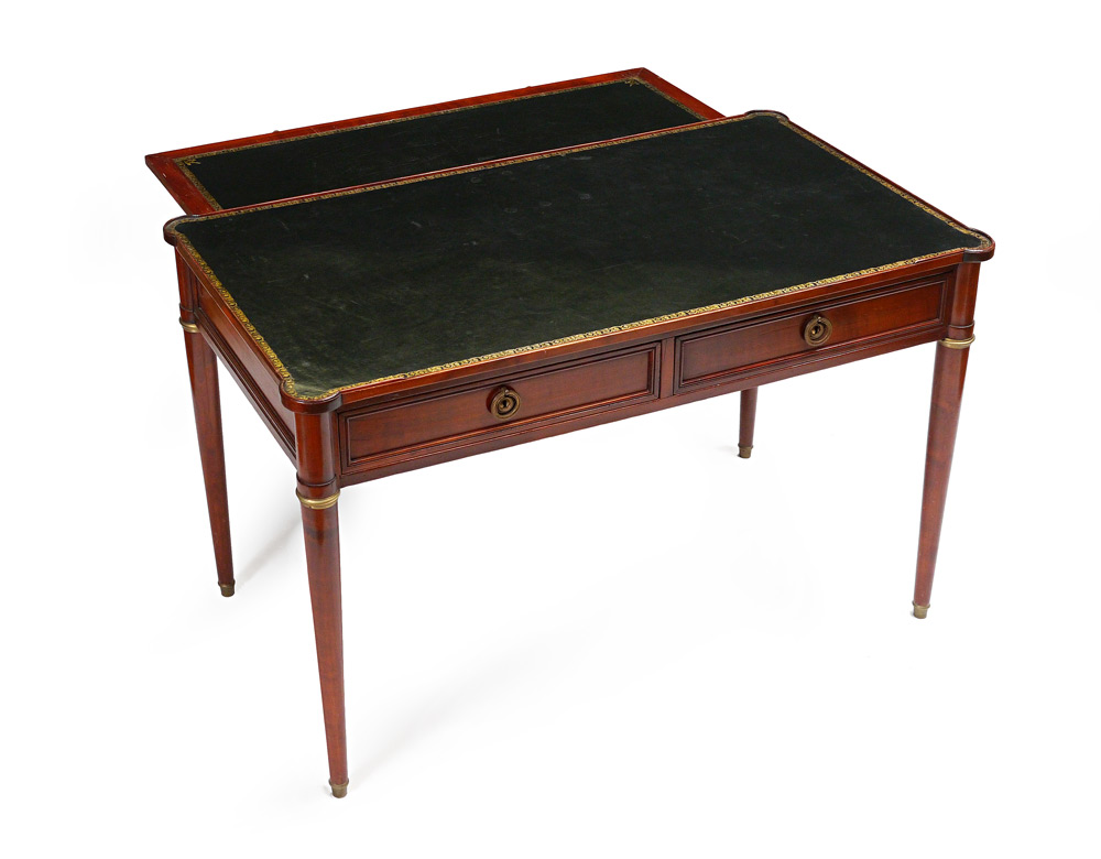 LEATHER TOP 2 DRAWER DESK: Black embossed leather top with cookie corners over slide out second writing surface with matching leather. 2 drawers, tapered legs. Overall 29 1/2'' h. x 47 1/4'' x 24 3/4''.