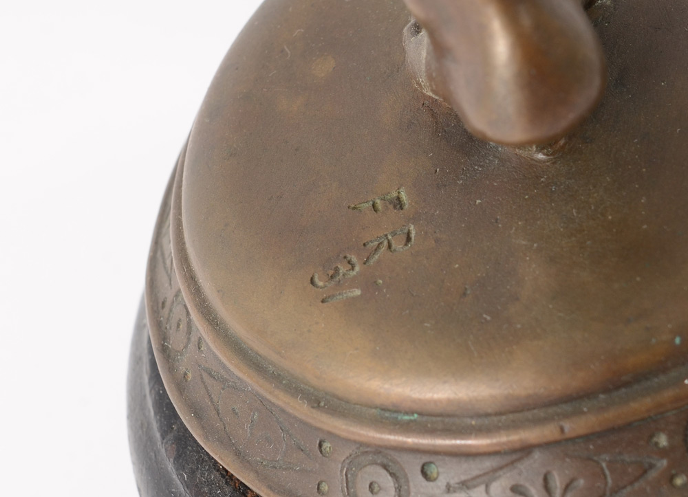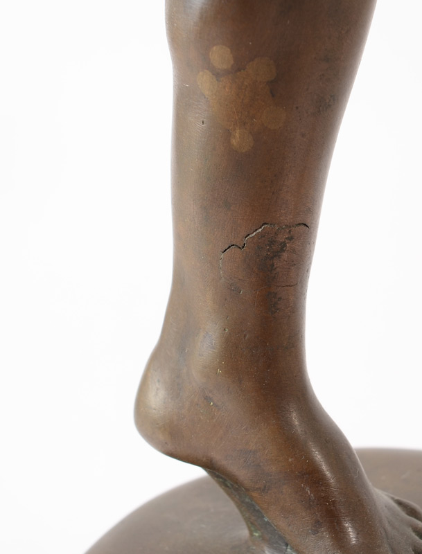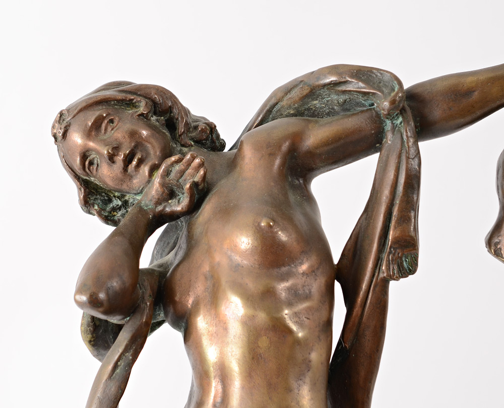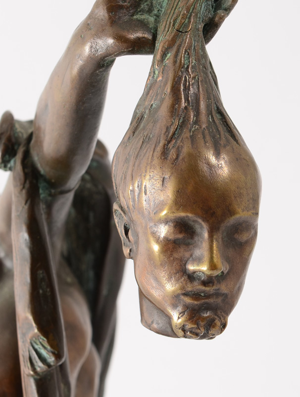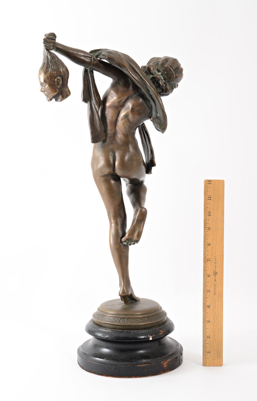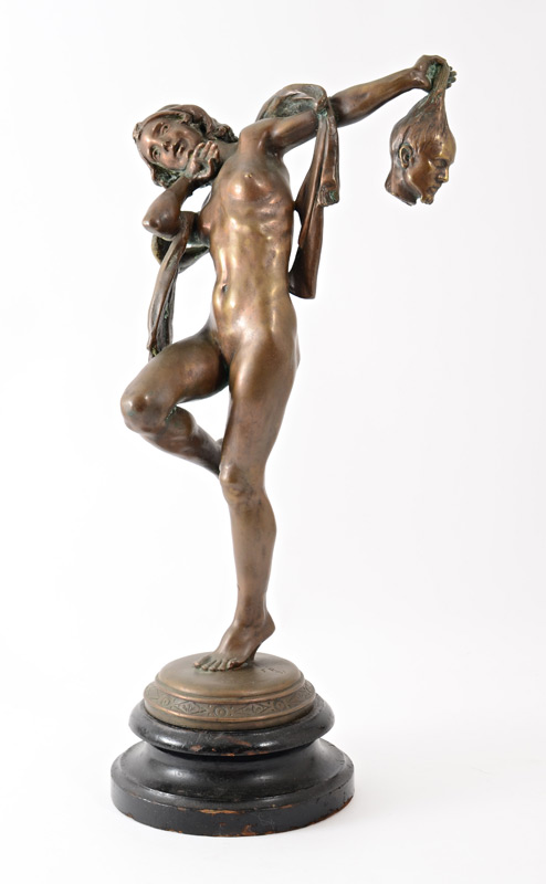 NUDE FEMALE BRONZE HOLDING THE HEAD OF JOHN THE BAPTIST: 19'' h., affixed to a painted and beveled wooden plinth with wear 21 1/2'' overall, monogrammed F.R., dated '31.
