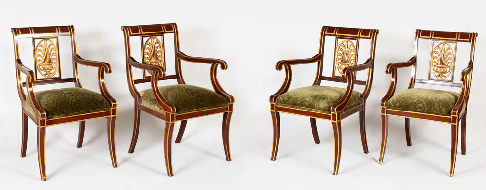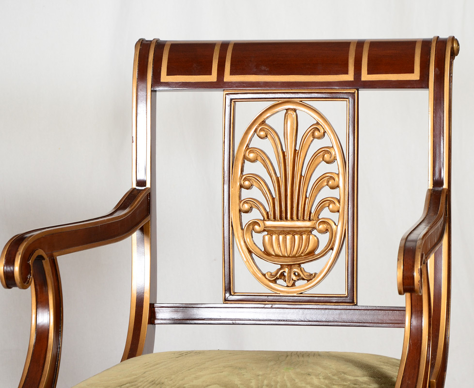 SET OF 4 COUNCILL FRENCH EMPIRE STYLE CHAIRS: Shaped top rail over pierced carved gilt foliate motif back splat, shaped arms and legs with applied gilt decoration. Patterned green upholstery. Councill tag under seat. 37'' h. x 22'' x 25''.