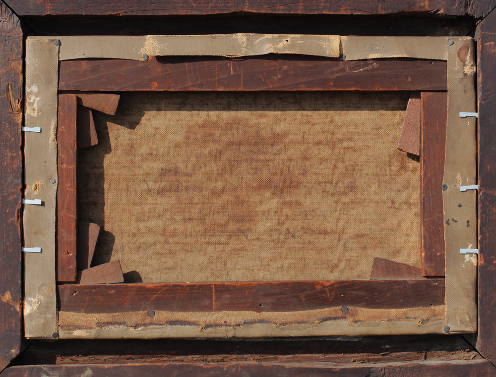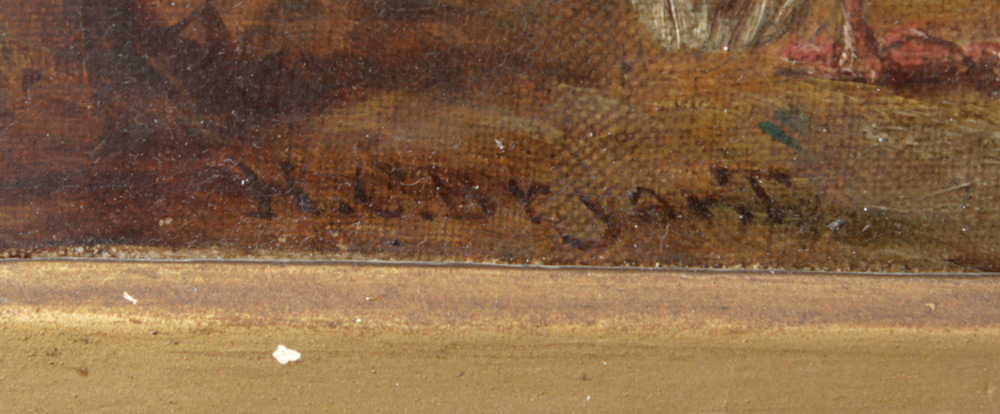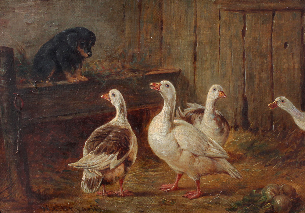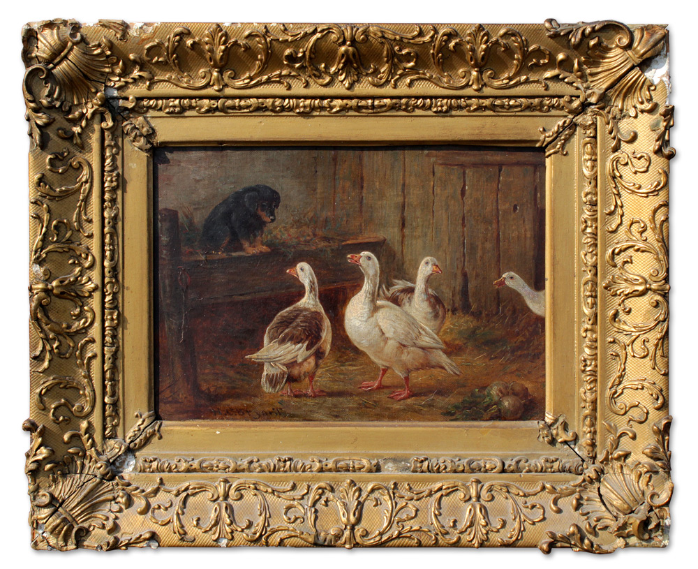 BRYANT, Henry Charles, (United Kingdom, 1835/36-1915): Barn Interior Scene with Curious Rottweiler Pup and Protective Geese, Oil/Canvas, 8'' x 12'', signed lower left, encased in a gilded foliate and shell motif gesso frame with wear and in need of repair 14 1/2'' x 18''.