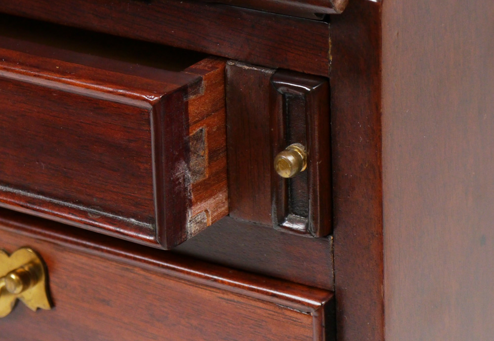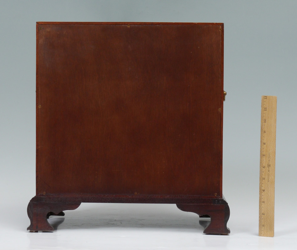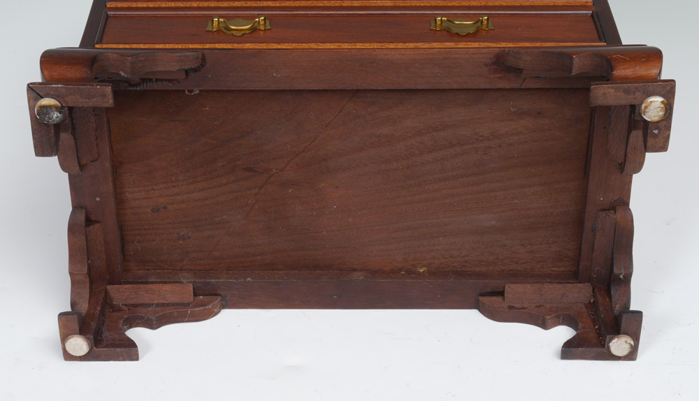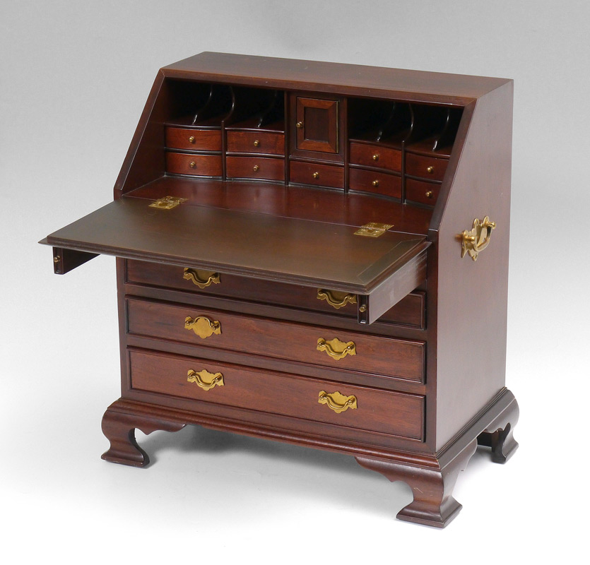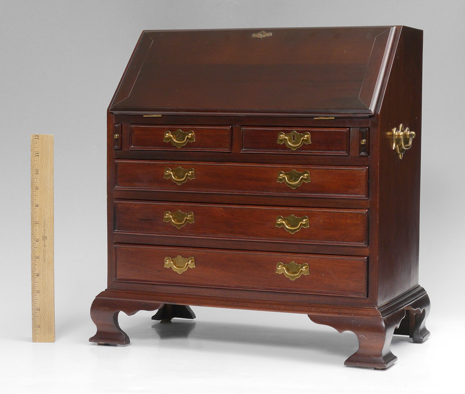 SALESMAN SAMPLE / CHILDS SLANT FRONT DESK: Early 20th century, mahogany, slant front secretary opens to shaped drawers, door and pigeon holes. 2 drawers over 3 graduating drawers, bracket feet. Overall 18 1/4'' h. x 17 1/2'' x 9 3/4''.