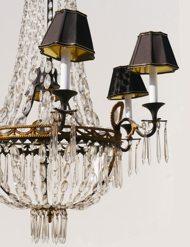 6 LIGHT GILT METAL & CRYSTAL CHANDELIER: 6 light chandelier, metal frame with gilt metal accents, strands of crystal garland and prisms. Overall 34 1/2'' x 27''