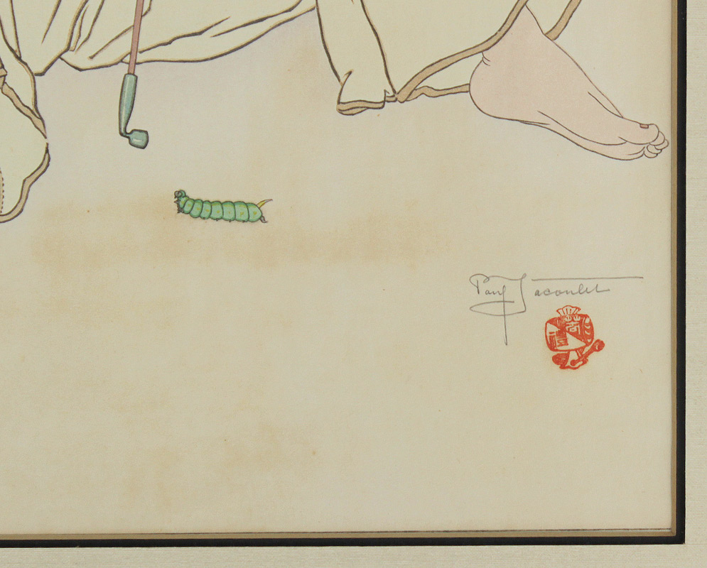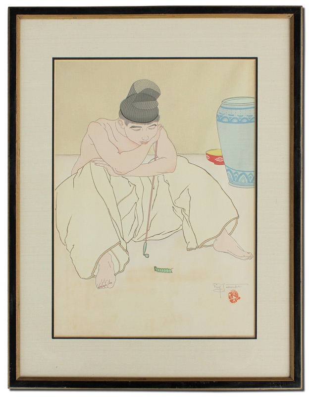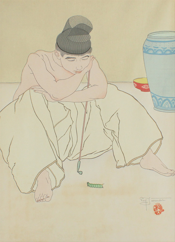 JACOULET, Paul, (French-Japanese, 1896-1960): ''La Chenille Verte'', Depicts a Young Boy Holding a Pipe Observing a Caterpillar, Woodblock Print, Sight size 15'' x 11 1/4'', pencil signed lower right, framed 21'' x 16 1/2''.