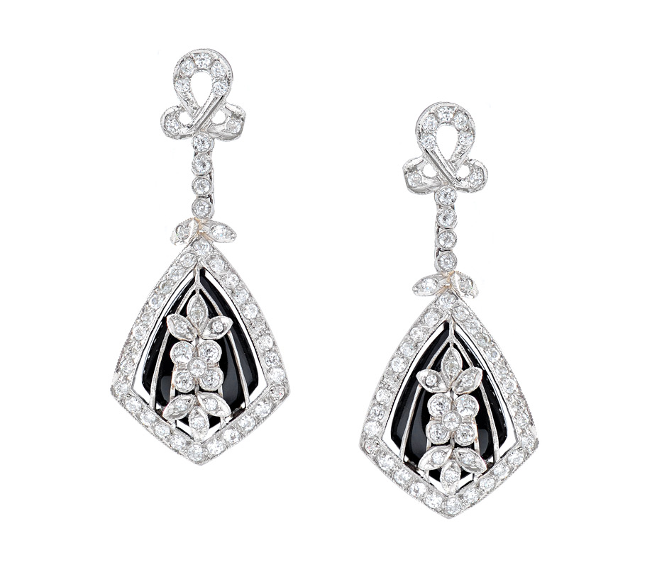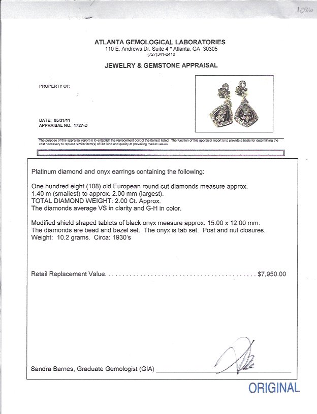 STUNNING ART DECO PLATINUM DIAMOND AND ONYX EAR PENDANTS: Ca. 1930's platinum earrings contain 108 Old European round cut diamonds, all totaling approx. 2 Ct., averaging VS in clarity and G-H color. The modified shield shaped tablets of black onyx are tab set, diamonds are bead and bezel set. Post and nut closure. Length 1.5'' Weight 10.2 grams. Sold with current Atlanta Gemological GIA graduates written appraisal for $7950