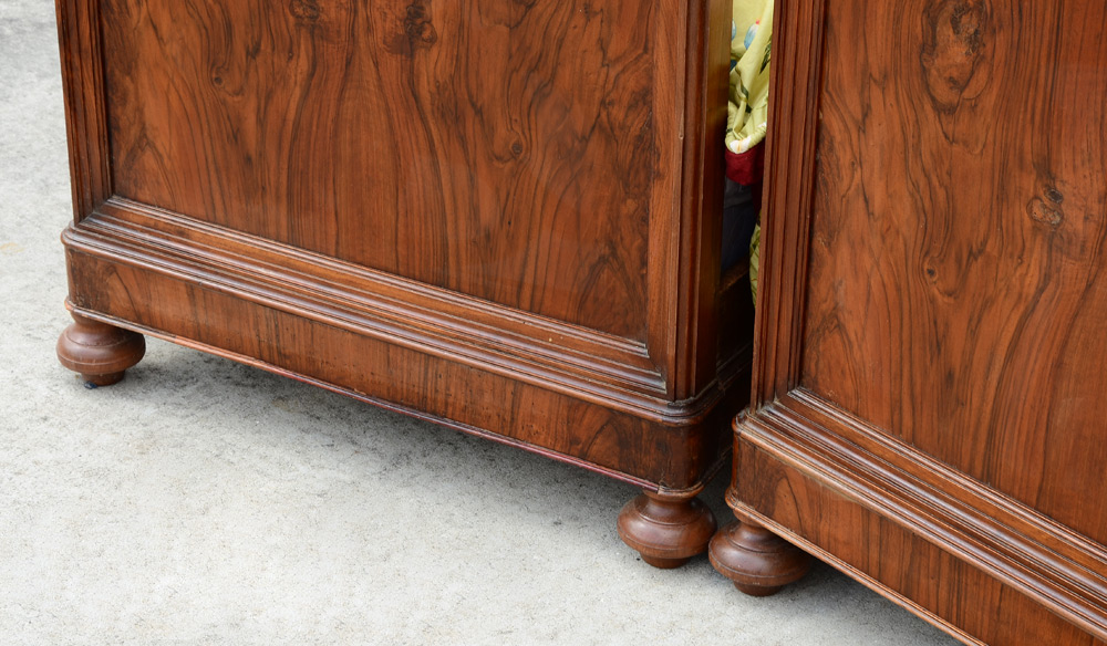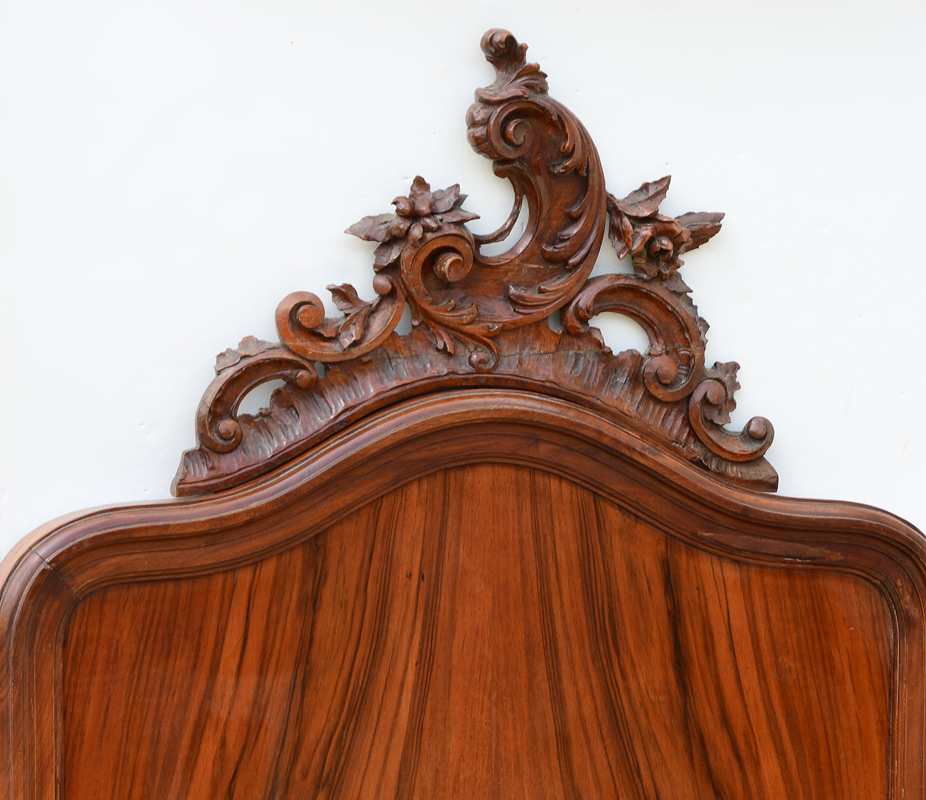 PR FRENCH ROSEWOOD VICTORIAN BEDS: Exquisitely carved twin beds each with removable foliate scroll crest, highly grained matchbook veneer headboards and footboards. Custom size, headboards measure 73'' h. x 33'', footboards 40 1/4'' h. x 33'', rails 77'' long. Custom mattresses are available with purchase of beds.